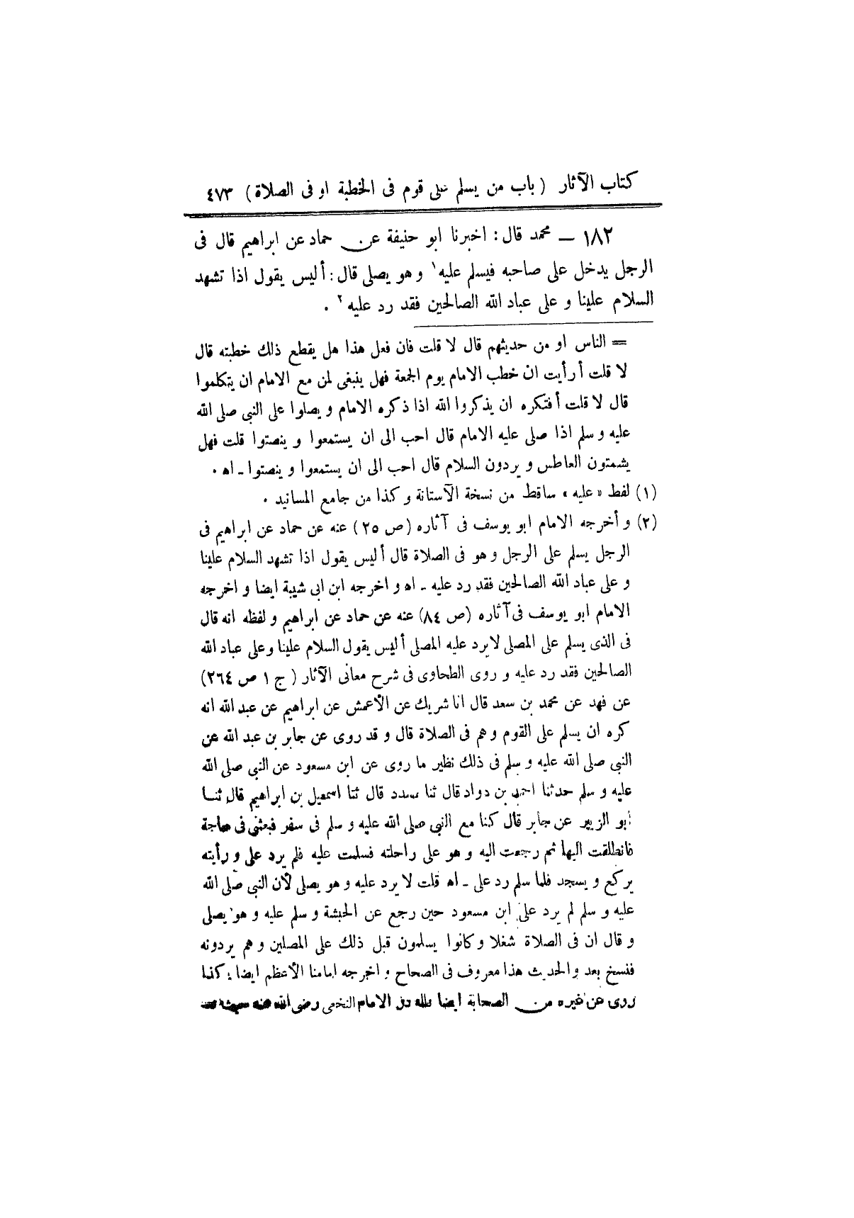 ١٨٢ - مُحَمَّدٌ، قَالَ: أَخْبَرَنَا أَبُو حَنِيفَةَ، عَنْ حَمَّادٍ، عَنْ إِبْرَاهِيمَ، قَالَ فِي " الرَّجُلِ يَدْخُلُ عَلَى صَاحِبِهِ، فَيُسَلِّمُ عَلَيْهِ وَهُوَ يُصَلِّي، قَالَ: أَلَيْسَ يَقُولُ إِذَا تَشَهَّدَ السَّلَامُ عَلَيْنَا وَعَلَى عِبَادِ اللَّهِ الصَّالِحِينَ. فَقَدْ رَدَّ عَلَيْهِ " ⦗٤٧٤⦘ قَالَ مُحَمَّدٌ: وَبِهِ نَأْخُذُ، وَلَا يُعْجِبُنَا أَنْ يَرُدَّ عَلَيْهِ السَّلَامَ، وَهُوَ يُصَلِّي، وَلَا يُعْجِبُنَا أَيْضًا أَنْ يُسَلِّمَ الرَّجُلُ عَلَيْهِ، وَهُوَ يُصَلِّي. وَهُوَ قَوْلُ أَبِي حَنِيفَةَ رَضِيَ اللَّهُ عَنْهُ