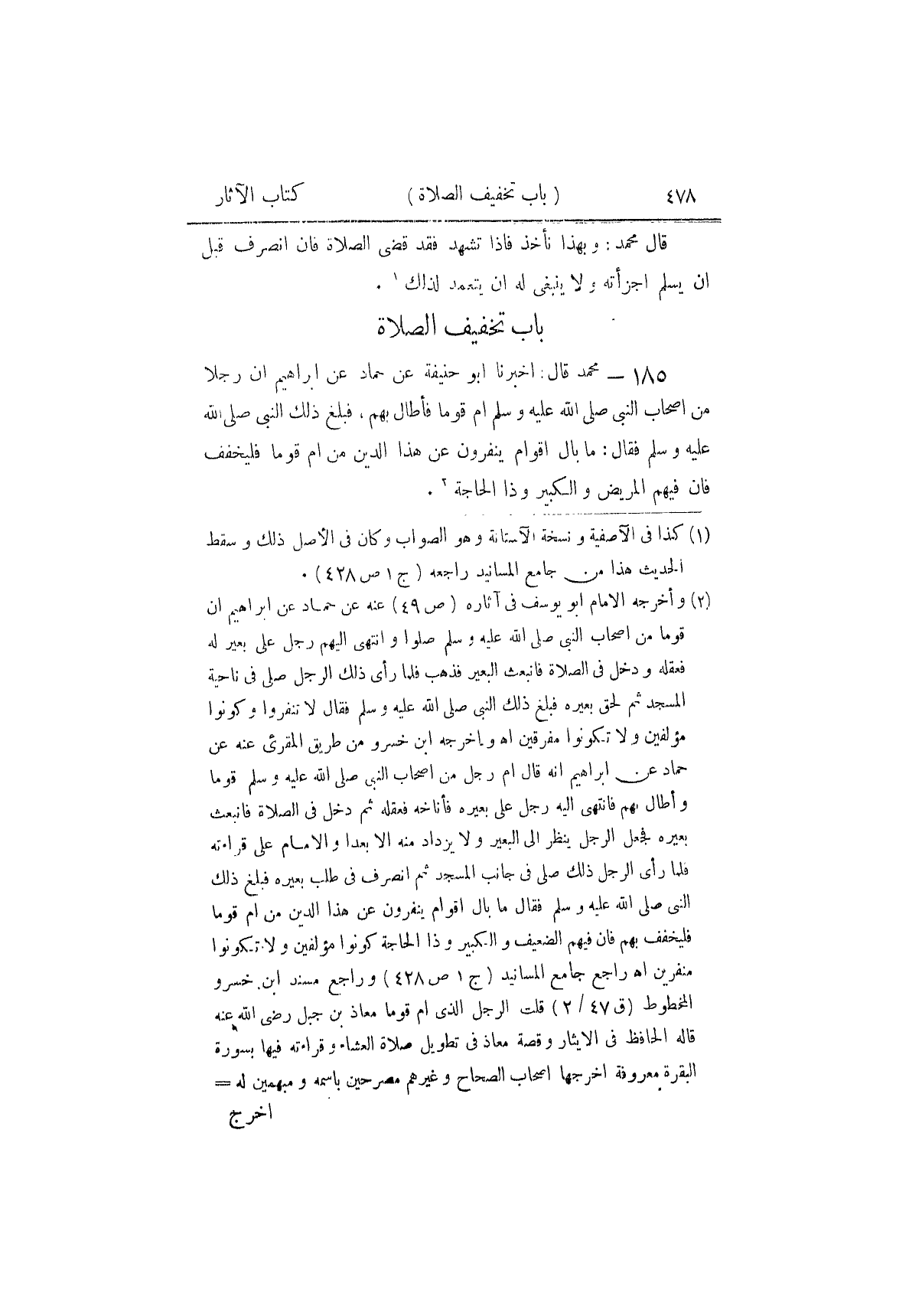 ١٨٥ - مُحَمَّدٌ، قَالَ: أَخْبَرَنَا أَبُو حَنِيفَةَ، عَنْ حَمَّادٍ، عَنْ إِبْرَاهِيمَ أَنَّ رَجُلًا مِنْ أَصْحَابِ النَّبِيِّ صَلَّى اللهُ عَلَيْهِ وَسَلَّمَ أَمَّ قَوْمًا فَأَطَالَ بِهِمْ، فَبَلَغَ ذَلِكَ النَّبِيَّ صَلَّى اللهُ عَلَيْهِ وَسَلَّمَ، فَقَالَ: «مَا بَالُ أَقْوَامٍ يُنَفِّرُونَ عَنْ هَذَا الدِّينِ مَنْ أَمَّ قَوْمًا فَلْيُخَفِّفْ؛ فَإِنَّ فِيهِمُ الْمَرِيضَ وَالْكَبِيرَ وَذَا الْحَاجَةِ» ⦗٤٨١⦘ قَالَ مُحَمَّدٌ: وَبِهِ نَأْخُذُ، وَلَابُدَّ أَنْ يُتِمَّ الرُّكُوعَ وَالسُّجُودَ. وَهُوَ قَوْلُ أَبِي حَنِيفَةَ رَضِيَ اللَّهُ عَنْهُ