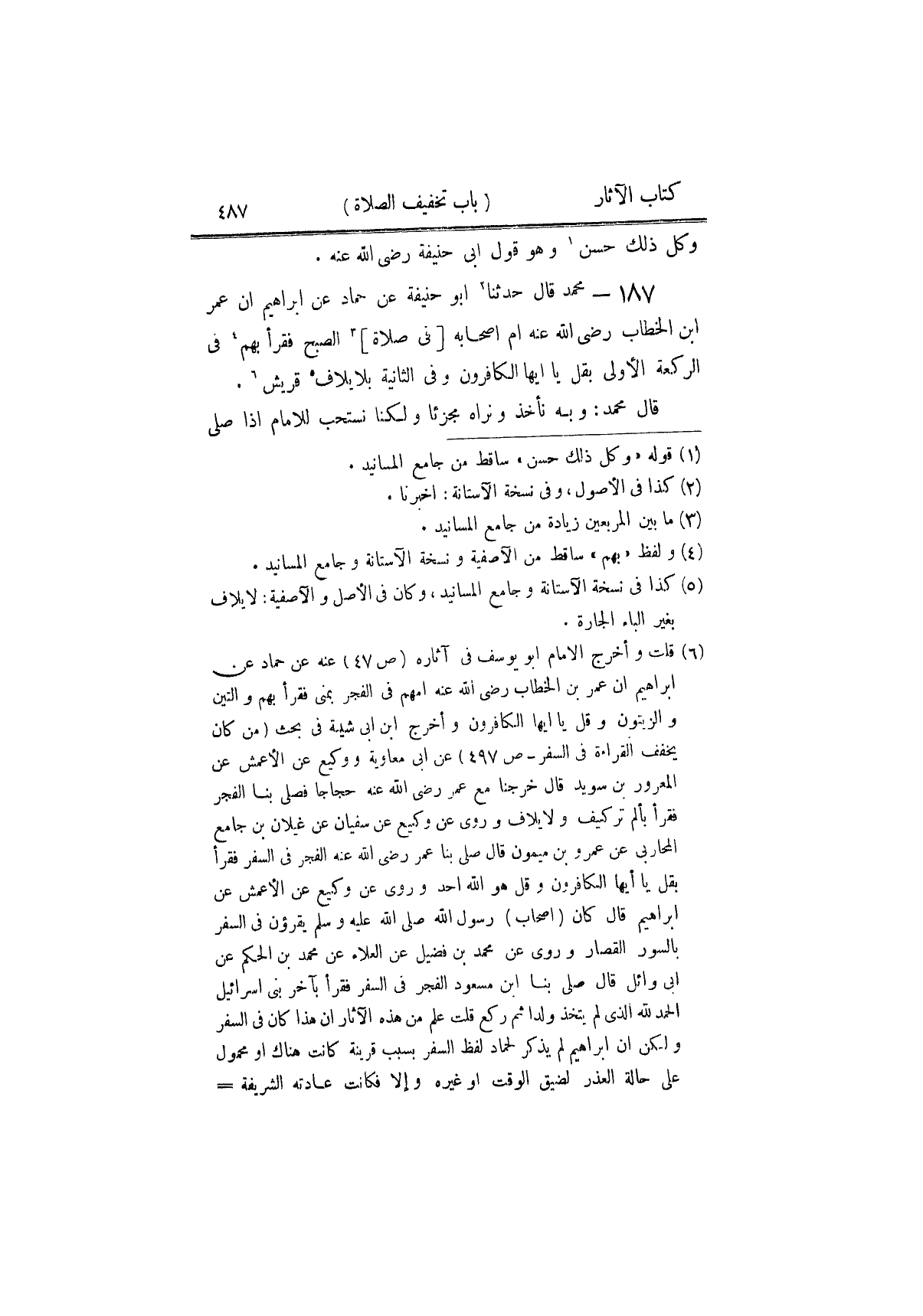 ١٨٧ - مُحَمَّدٌ، قَالَ: حَدَّثَنَا أَبُو حَنِيفَةَ، عَنْ حَمَّادٍ، عَنْ إِبْرَاهِيمَ، أَنَّ عُمَرَ بْنَ الْخَطَّابِ رَضِيَ اللَّهُ عَنْهُ أَمَّ أَصْحَابَهُ فِي صَلَاةِ الصُّبْحِ، فَقَرَأَ بِهِمْ فِي الرَّكْعَةِ الْأُولَى بِـ قُلْ يَا أَيُّهَا الْكَافِرُونَ وَفِي الثَّانِيَةِ بِ لِإِيلَافِ قُرَيْشٍ قَالَ مُحَمَّدٌ: وَبِهِ نَأْخُذُ، وَنَرَاهُ مُجْزِئًا وَلَكِنَّا نَسْتَحِبُّ لِلْإِمَامِ إِذَا صَلَّى ⦗٤٨٨⦘ الصُّبْحَ، وَهُوَ مُقِيمٌ أَنْ يُطِيلَ فِيهَا الْقِرَاءَةَ، أَنْ يَقْرَأَ فِي كُلِّ رَكْعَةٍ بِسُورَةٍ تَكُونُ عِشْرِينَ آيَةً فَصَاعِدًا سِوَى فَاتِحَةِ الْكِتَابِ وَيُطِيلُ الْأُولَى عَلَى الثَّانِيَةِ، وَهُو قَوْلُ أَبِي حَنِيفَةَ رَضِيَ اللَّهُ عَنْهُ