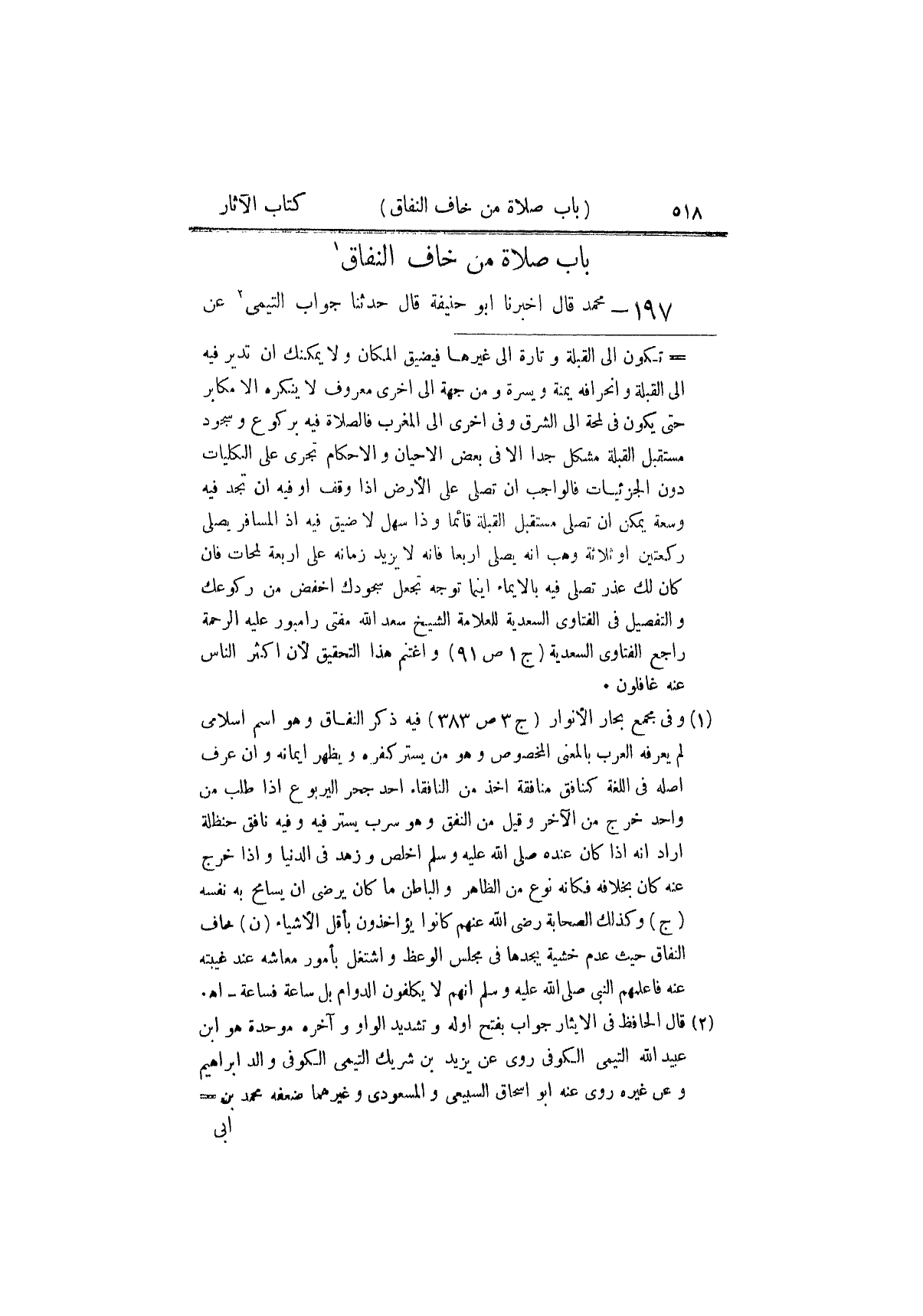 ١٩٧ - مُحَمَّدٌ، قَالَ: أَخْبَرَنَا أَبُو حَنِيفَةَ، قَالَ: حَدَّثَنَا جَوَّابٌ التَّيْمِيُّ، عَنْ ⦗٥١٩⦘ أَبِي مُوسَى الْأَشْعَرِيِّ رَضِيَ اللَّهُ عَنْهُ أَنَّ رَجُلًا أَتَاهُ، فَقَالَ: إِنِّي أَتَخَوَّفُ عَلَى نَفْسِي النِّفَاقَ، فَقَالَ لَهُ أَبُو مُوسَى: «أَمَا صَلَّيْتَ قَطُّ حَيْثُ لَا يَرَاكَ أَحَدٌ إِلَّا اللَّهُ» قَالَ: بَلَى، قَالَ: «فَإِنَّ الْمُنَافِقَ لَا يُصَلِّي حَيْثُ لَا يَرَاهُ أَحَدٌ إِلَّا اللَّهُ عَزَّ وَجَلَّ»