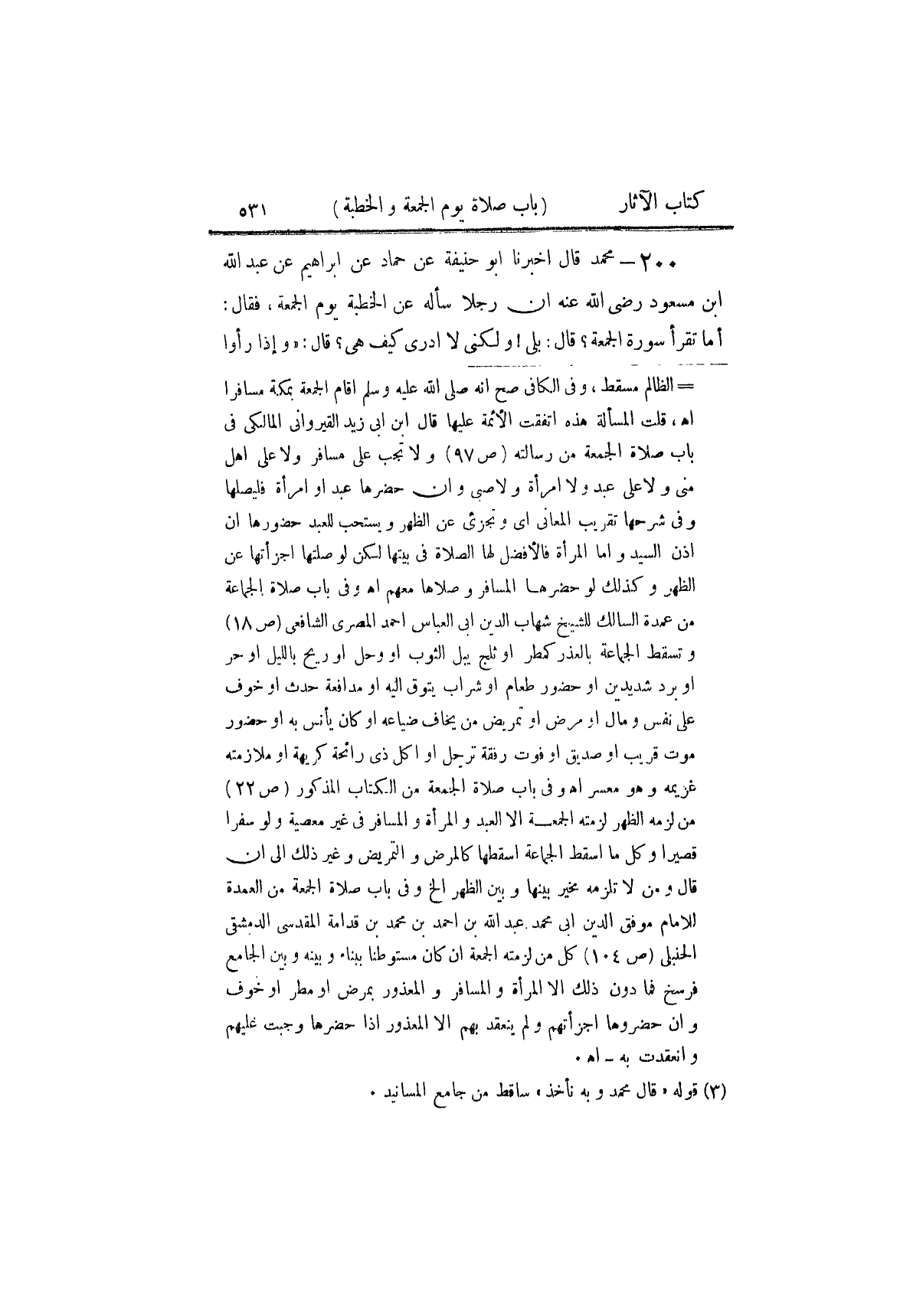 ٢٠٠ - أَخْبَرَنَا أَبُو حَنِيفَةَ، عَنْ حَمَّادٍ، عَنْ إِبْرَاهِيمَ، عَنْ عَبْدِ اللَّهِ بْنِ مَسْعُودٍ رَضِيَ اللَّهُ عَنْهُ أَنَّ رَجُلًا سَأَلَهُ عَنِ الْخُطْبَةِ يَوْمَ الْجُمُعَةِ، فَقَالَ: «أَمَا تَقْرَأُ سُورَةَ الْجُمُعَةِ؟» قَالَ: بَلَى وَلَكِنِّي لَا أَدْرِي كَيْفَ هِيَ؟ قَالَ: {وَإِذَا رَأَوْا ⦗٥٣٢⦘ تِجَارَةً أَوْ لَهْوًا انْفَضُّوا إِلَيْهَا وَتَرَكُوكَ قَائِمًا} [الجمعة: ١١] «فَالْخُطْبَةُ قَائِمًا يَوْمَ الْجُمُعَةِ» ⦗٥٣٤⦘ قَالَ مُحَمَّدٌ: وَبِهِ نَأْخُذُ، إِلَّا أَنَّهَا خُطْبَتَانِ بَيْنَهُمَا جِلْسَةٌ خَفِيفَةٌ وَهُوَ قَوْلُ أَبِي حَنِيفَةَ رَضِيَ اللَّهُ عَنْهُ