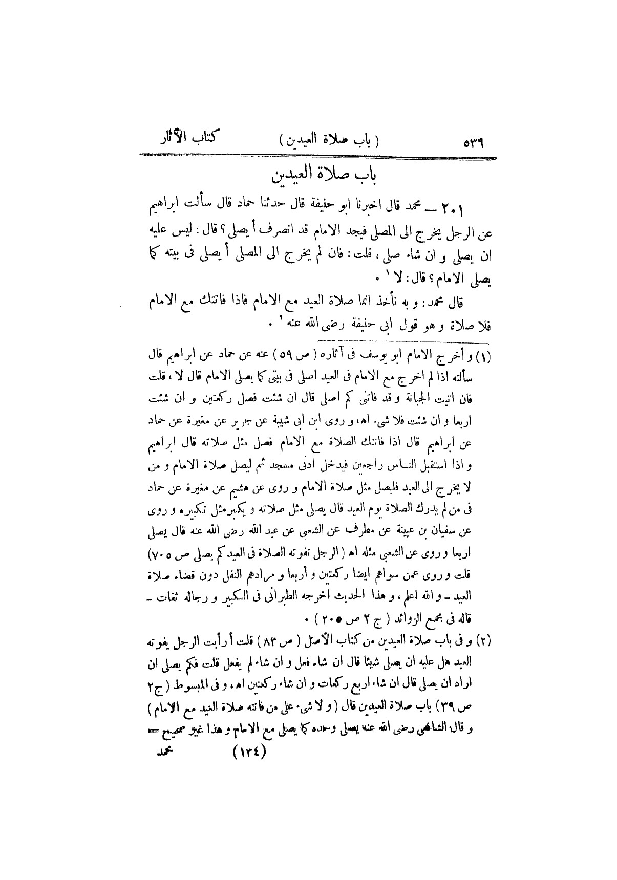 ٢٠١ - مُحَمَّدٌ، قَالَ: أَخْبَرَنَا أَبُو حَنِيفَةَ، قَالَ حَدَّثَنَا حَمَّادٌ، قَالَ: سَأَلْتُ إِبْرَاهِيمَ عَنِ الرَّجُلِ يَخْرُجُ إِلَى الْمُصَلَّى فَيَجِدُ الْإِمَامَ قَدِ انْصَرَفَ أَيُصَلِّي؟ قَالَ: «لَيْسَ عَلَيْهِ أَنْ يُصَلِّيَ، وَإِنْ شَاءَ صَلَّى» قُلْتُ: فَإِنْ لَمْ يَخْرُجْ إِلَى الْمُصَلَّى أَيُصَلِّي فِي بَيْتِهِ كَمَا يُصَلِّي الْإِمَامُ؟ قَالَ: «لَا» قَالَ مُحَمَّدٌ: وَبِهِ نَأْخُذُ، إِنَّمَا صَلَاةُ الْعِيدِ مَعَ الْإِمَامِ فَإِذَا فَاتَتْكَ مَعَ الْإِمَامِ فَلَا صَلَاةَ. وَهُوَ قَوْلُ أَبِي حَنِيفَةَ رَضِيَ اللَّهُ عَنْهُ