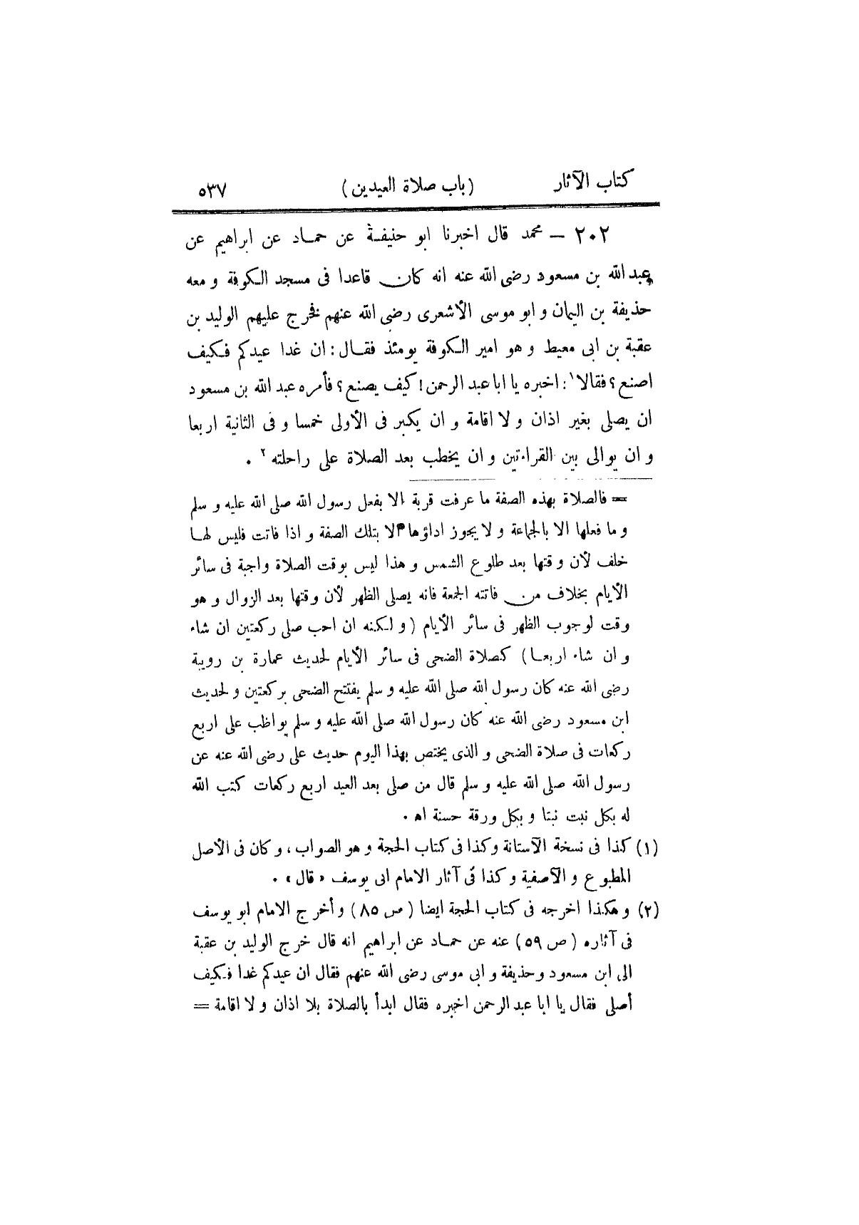 ٢٠٢ - مُحَمَّدٌ، قَالَ: أَخْبَرَنَا أَبُو حَنِيفَةَ، عَنْ حَمَّادٍ، عَنْ إِبْرَاهِيمَ، عَنْ عَبْدِ اللَّهِ بْنِ مَسْعُودٍ رَضِيَ اللَّهُ أَنَّهُ كَانَ قَاعِدًا فِي مَسْجِدِ الْكُوفَةِ وَمَعَهُ حُذَيْفَةُ بْنُ الْيَمَانِ وَأَبُو مُوسَى الْأَشْعَرِيُّ رَضِيَ اللَّهُ عَنْهُمْ فَخَرَجَ عَلَيْهِمُ الْوَلِيدُ بْنُ عُقْبَةَ بْنِ أَبِي مُعَيْطٍ - وَهُوَ أَمِيرُ الْكُوفَةِ يَوْمَئِذٍ - فَقَالَ: إِنَّ غَدًا عِيدَكُمْ فَكَيْفَ أَصْنَعُ؟ فَقَالَا: أَخْبِرْهُ يَا أَبَا عَبْدِ الرَّحْمَنِ كَيْفَ يَصْنَعُ؟ فَأَمَرَهُ عَبْدُ اللَّهِ بْنُ مَسْعُودٍ أَنْ يُصَلِّيَ بِغَيْرِ أَذَانٍ وَلَا إِقَامَةٍ وَأَنْ يُكَبِّرَ فِي الْأُولَى خَمْسًا وَفِي الثَّانِيَةِ أَرْبَعًا وَأَنْ يُوَالِيَ بَيْنَ الْقِرَاءَتَيْنِ وَأَنْ يَخْطُبَ بَعْدَ الصَّلَاةِ عَلَى رَاحِلَتِهِ " ⦗٥٤٤⦘ قَالَ مُحَمَّدٌ: وَبِهِ نَأْخُذُ، وَلَا بَأْسَ أَنْ يَخْطُبَهَا قَائِمًا، وَإِنْ لَمْ يَكُنْ عَلَى رَاحِلَتِهِ، وَهُوَ قَوْلُ أَبِي حَنِيفَةَ رَضِيَ اللَّهُ عَنْهُ