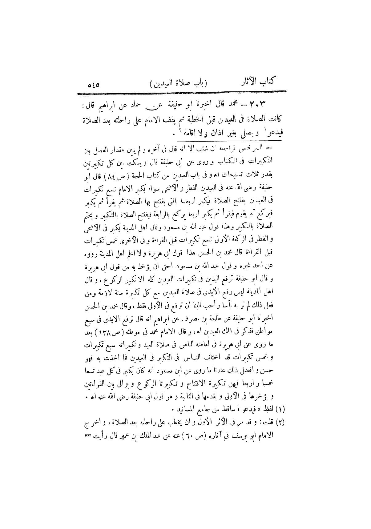 ٢٠٣ - مُحَمَّدٌ، قَالَ: أَخْبَرَنَا أَبُو حَنِيفَةَ، عَنْ حَمَّادٍ، عَنْ إِبْرَاهِيمَ، قَالَ: «كَانَتِ الصَّلَاةُ فِي الْعِيدَيْنِ قَبْلَ الْخُطْبَةِ ثُمَّ يَقِفُ الْإِمَامُ عَلَى رَاحِلَتِهِ بَعْدَ الصَّلَاةِ فَيَدْعُو وَيُصَلِّي بِغَيْرِ أَذَانٍ، وَلَا إِقَامَةٍ»