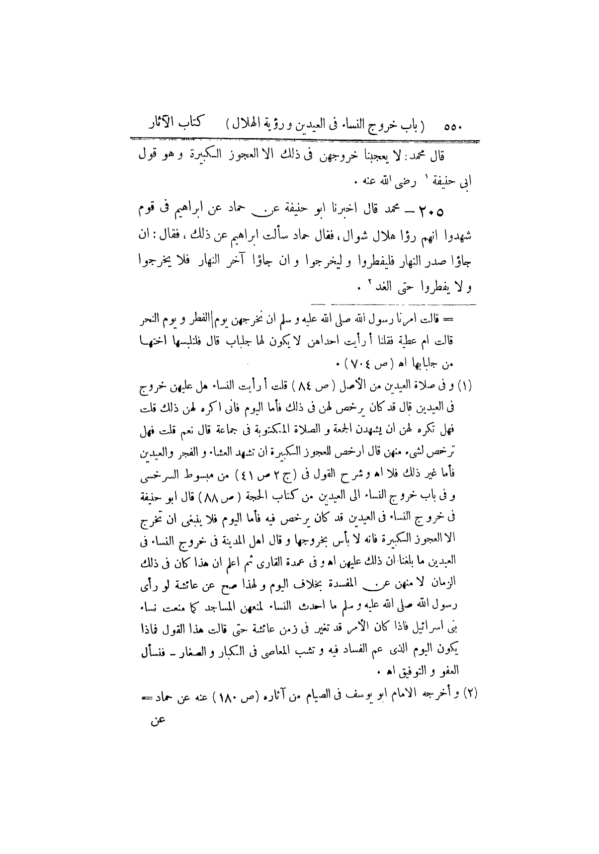 ٢٠٥ - مُحَمَّدٌ، قَالَ: أَخْبَرَنَا أَبُو حَنِيفَةَ، عَنْ حَمَّادٍ، عَنْ إِبْرَاهِيمَ فِي قَوْمٍ شَهِدُوا أَنَّهُمْ رَأَوْا هِلَالَ شَوَّالٍ فَقَالَ حَمَّادٌ: سَأَلْتُ إِبْرَاهِيمَ عَنْ ذَلِكَ، فَقَالَ: «إِنْ جَاءُوا صَدْرَ النَّهَارِ فَلْيُفْطِرُوا وَلْيَخْرُجُوا، وَإِنْ جَاءُوا آخِرَ النَّهَارِ، فَلَا يَخْرُجُوا وَلَا يُفْطِرُوا حَتَّى الْغَدِ» ⦗٥٥٣⦘ قَالَ مُحَمَّدٌ: وَبِهِ نَأْخُذُ، إِلَّا فِي خَصْلَةٍ وَاحِدَةٍ، يُفْطِرُونَ وَيَخْرُجُونَ مِنَ الْغَدِ إِذَا جَاءُوا مِنَ الْعَشِيِّ. وَهُوَ قَوْلُ أَبِي حَنِيفَةَ رَضِيَ اللَّهُ عَنْهُ