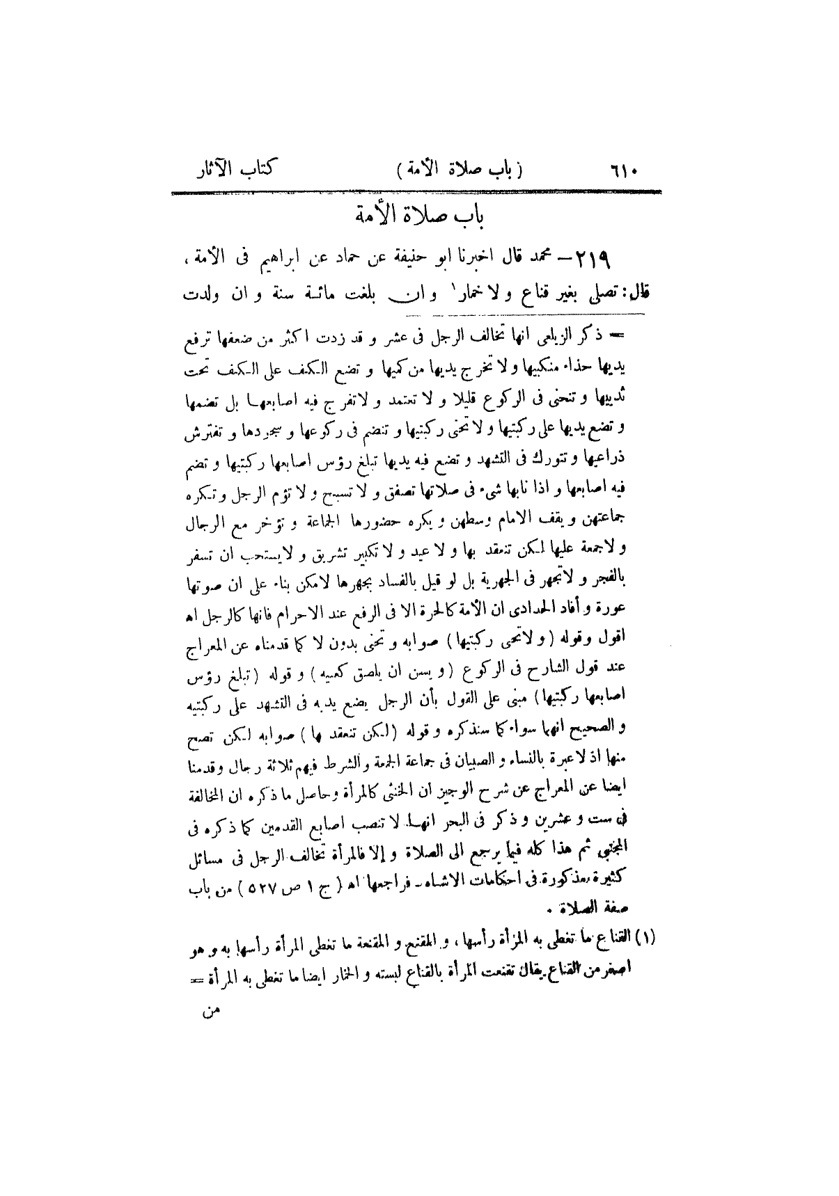 ٢١٩ - مُحَمَّدٌ، قَالَ: أَخْبَرَنَا أَبُو حَنِيفَةَ، عَنْ حَمَّادٍ، عَنْ إِبْرَاهِيمَ فِي الْأَمَةِ، قَالَ: «تُصَلِّي بِغَيْرِ قِنَاعٍ وَلَا خِمَارٍ، وَإِنْ بَلَغَتْ مِائَةَ سَنَةٍ، وَإِنْ وَلَدَتْ ⦗٦١١⦘ مِنْ سَيِّدِهَا»