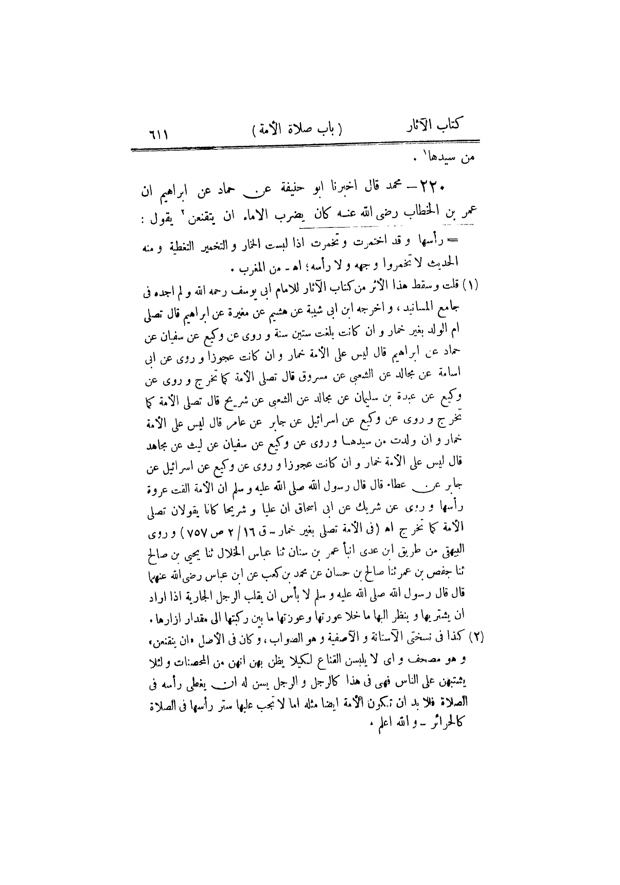 ٢٢٠ - مُحَمَّدٌ، قَالَ: أَخْبَرَنَا أَبُو حَنِيفَةَ، عَنْ حَمَّادٍ، عَنْ إِبْرَاهِيمَ، أَنَّ عُمَرَ بْنَ الْخَطَّابِ رَضِيَ اللَّهُ عَنْهُ كَانْ يَضْرِبُ الْإِمَاءَ أَنْ يَتَقَنَّعْنَ، يَقُولُ ⦗٦١٢⦘: «لَا تَتَشَبَّهِينَ بِالْحَرَائِرِ» ⦗٦١٣⦘ قَالَ مُحَمَّدٌ: وَبِهِ نَأْخُذُ، لَا نَرَى عَلَى الْأَمَةِ قِنَاعًا فِي صَلَاةٍ وَلَا غَيْرَهَا، وَهُوَ قَوْلُ أَبِي حَنِيفَةَ رَضِيَ اللَّهُ عَنْهُ