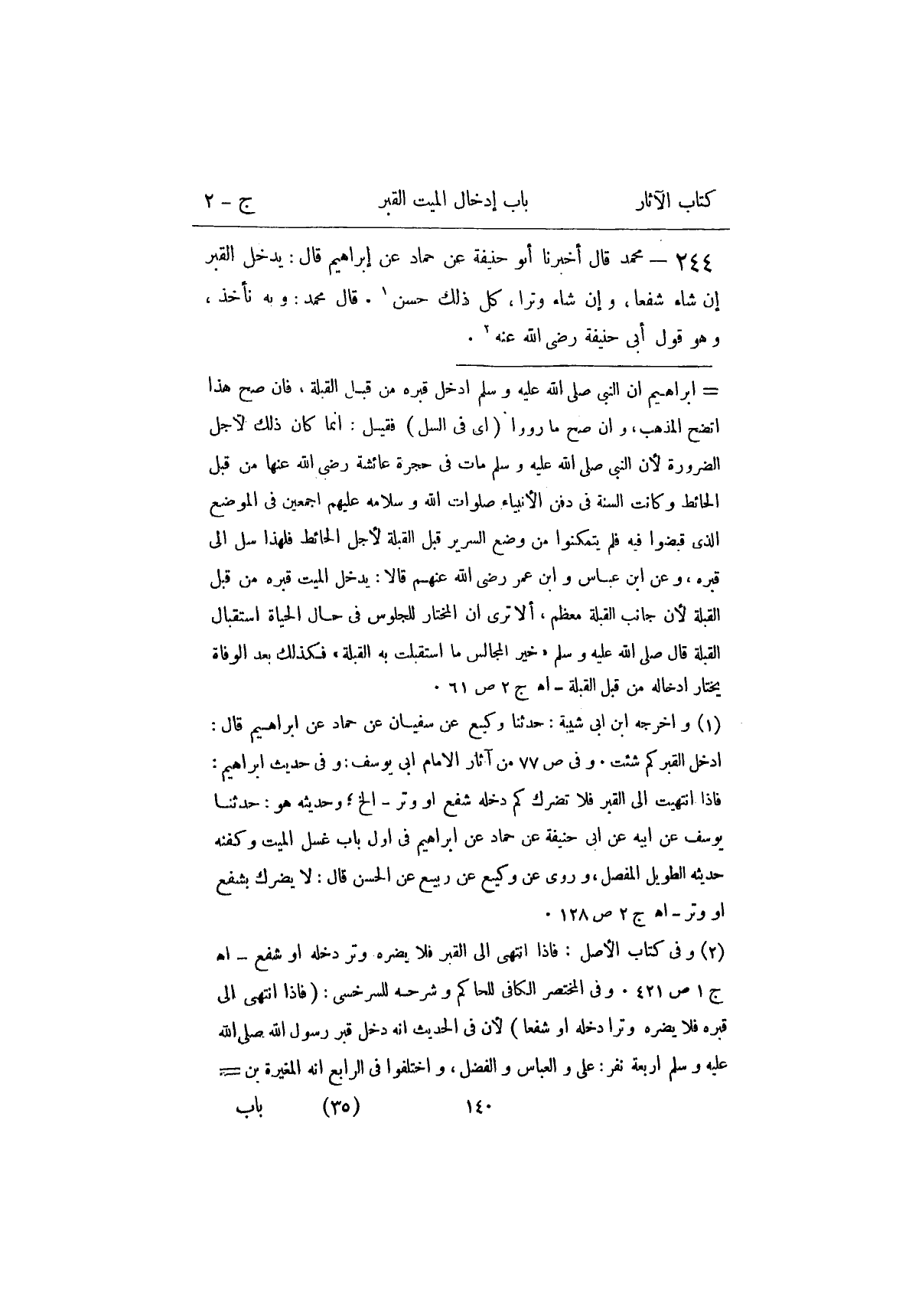 ٢٤٤ - مُحَمَّدٌ، قَالَ: أَخْبَرَنَا أَبُو حَنِيفَةَ، عَنْ حَمَّادٍ، عَنْ إِبْرَاهِيمَ، قَالَ: يَدْخُلُ الْقَبْرَ إِنْ شَاءَ شَفْعًا، وَإِنْ شَاءَ وِتْرًا، كُلُّ ذَلِكَ حَسَنٌ قَالَ مُحَمَّدٌ: وَبِهِ نَأْخُذُ. وَهُوَ قَوْلُ أَبِي حَنِيفَةَ رَضِيَ اللَّهُ عَنْهُ