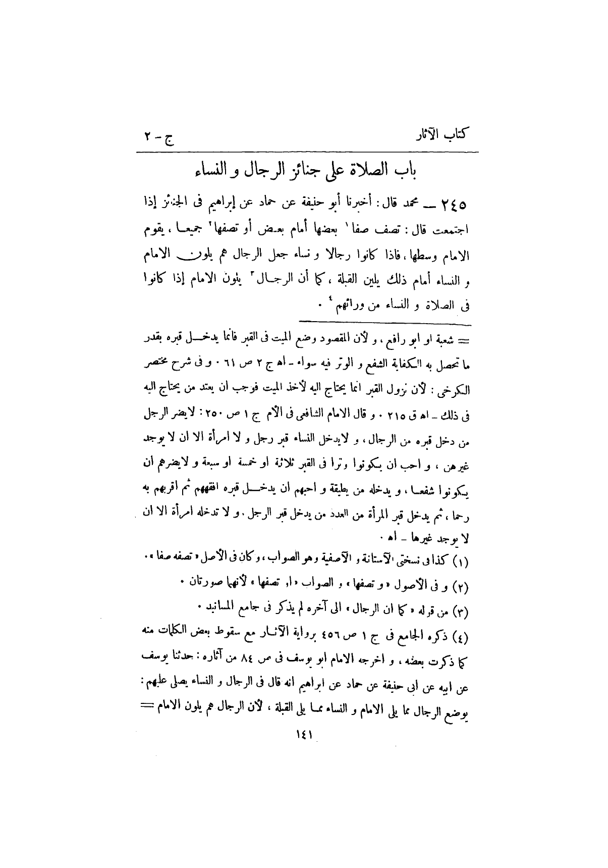 ٢٤٥ - مُحَمَّدٌ، قَالَ: أَخْبَرَنَا أَبُو حَنِيفَةَ، عَنْ حَمَّادٍ، عَنْ إِبْرَاهِيمَ فِي الْجَنَائِزِ إِذَا اجْتَمَعَتْ، قَالَ: «تُصَفُّ صَفًّا بَعْضُهَا أَمَامَ بَعْضٍ أَوْ تُصَفُّهَا جَمِيعًا، يَقُومُ الْإِمَامُ وَسْطَهَا، فَإِذَا كَانُوا رِجَالًا وَنِسَاءً، جُعِلَ الرِّجَالُ هُمْ يَلُونَ الْإِمَامَ، وَالنِّسَاءُ أَمَامَ ذَلِكَ يَلِينَ الْقِبْلَةَ، كَمَا أَنَّ الرِّجَالَ يَلُونَ الْإِمَامَ إِذَا كَانُوا فِي الصَّلَاةِ وَالنِّسَاءِ مِنْ وَرَائِهِمْ» ⦗١٤٢⦘ قَالَ مُحَمَّدٌ: وَبِهِ نَأْخُذُ. وَهُوَ قَوْلُ أَبِي حَنِيفَةَ رَضِيَ اللَّهُ عَنْهُ