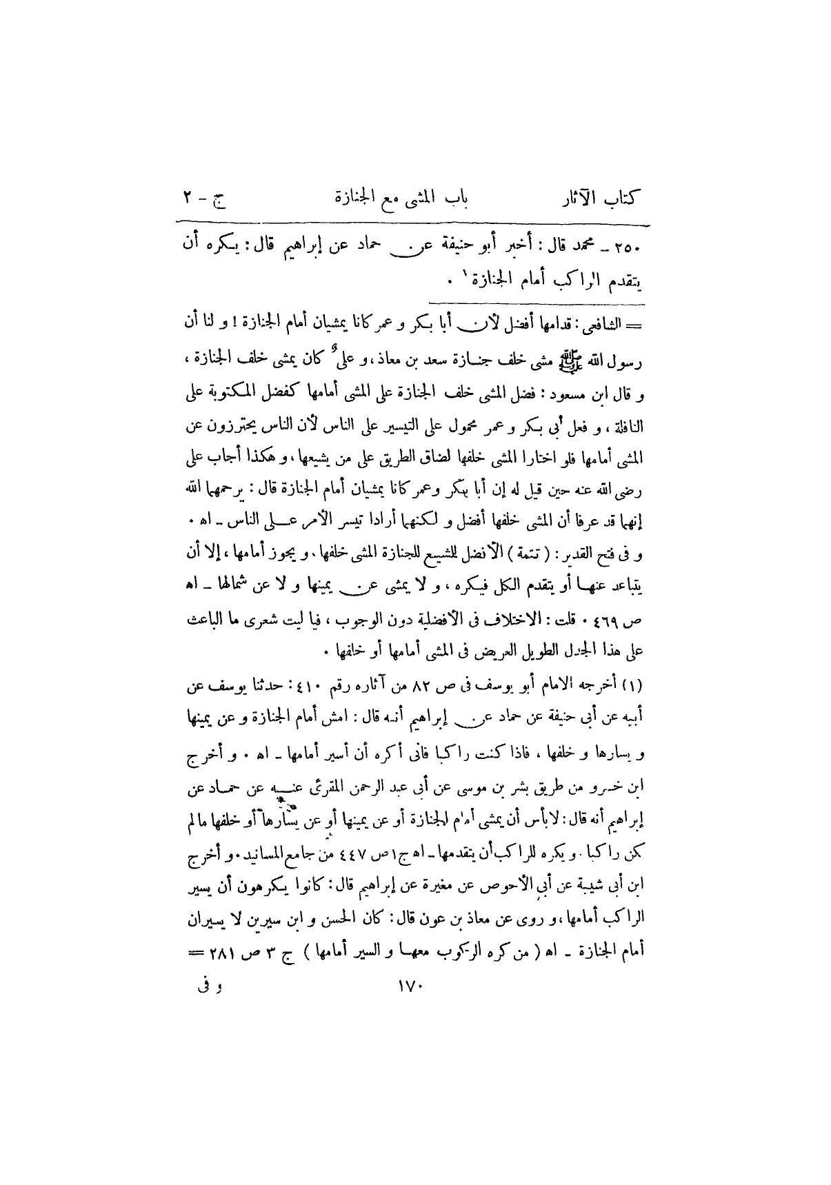 ٢٥٠ - مُحَمَّدٌ، قَالَ: أَخْبَرَ أَبُو حَنِيفَةَ، عَنْ حَمَّادٍ، عَنْ إِبْرَاهِيمَ، قَالَ: يُكْرَهُ أَنْ يَتَقَدَّمَ الرَّاكِبُ أَمَامَ الْجَنَازَةِ ⦗١٧٢⦘، قَالَ مُحَمَّدٌ: وَبِهِ نَأْخُذُ، وَهُوَ قَوْلُ أَبِي حَنِيفَةَ رَضِيَ اللَّهُ عَنْهُ
