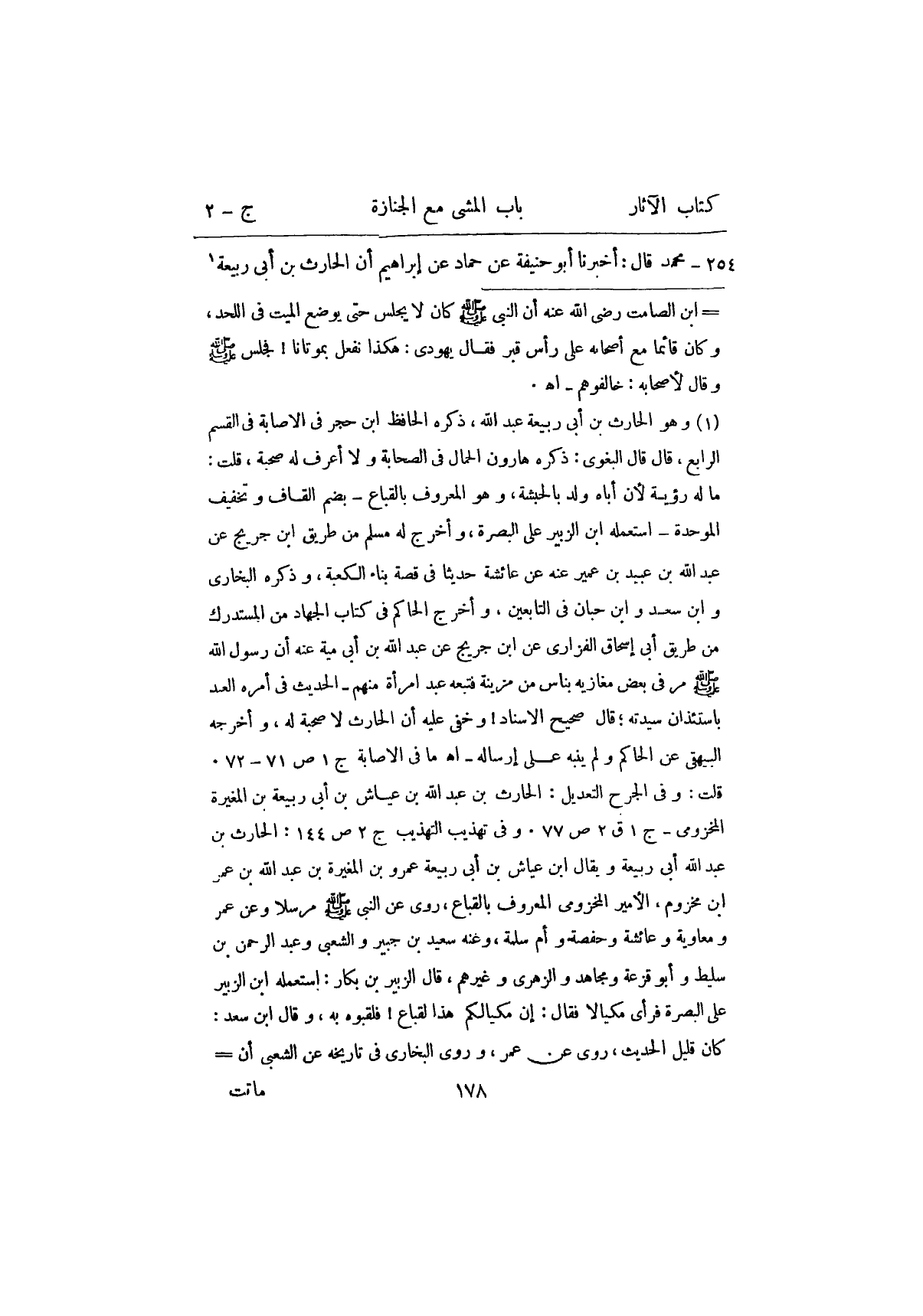 ٢٥٤ - مُحَمَّدٌ، قَالَ: أَخْبَرَنَا أَبُو حَنِيفَةَ، عَنْ حَمَّادٍ، عَنْ إِبْرَاهِيمَ، أَنَّ الْحَارِثَ بْنَ أَبِي رَبِيعَةَ ⦗١٧٩⦘ مَاتَتْ أُمُّهُ النَّصْرَانِيَّةُ، فَتَبِعَ جَنَازَتَهَا فِي رَهْطٍ مِنْ أَصْحَابِ النَّبِيِّ صَلَّى اللهُ عَلَيْهِ وَسَلَّمَ ⦗١٨١⦘ قَالَ مُحَمَّدٌ: لَا نَرَى بِاتِّبَاعِهَا بَأْسًا، إِلَّا أَنَّهُ يَتَنَحَّى نَاحِيَةً عَنِ الْجَنَازَةِ، وَهُوَ قَوْلُ أَبِي حَنِيفَةَ رَضِيَ اللَّهُ عَنْهُ
