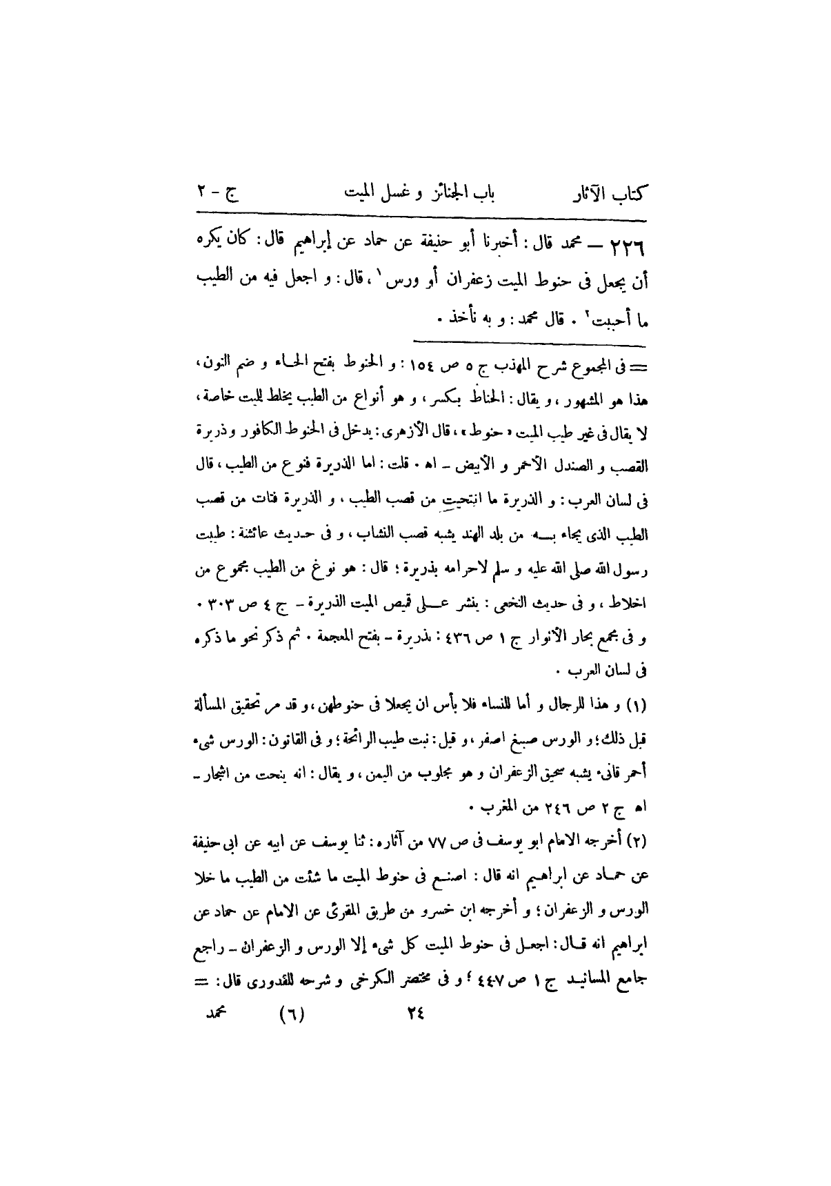 ٢٢٦ - مُحَمَّدٌ، قَالَ: أَخْبَرَنَا أَبُو حَنِيفَةَ عَنْ حَمَّادٍ، عَنْ إِبْرَاهِيمَ، قَالَ: كَانَ يُكْرَهُ أَنْ يُجْعَلَ فِي حَنُوطِ الْمَيِّتِ زَعْفَرَانٌ أَوْ وَرْسٌ، قَالَ: وَاجْعَلْ فِيهِ مِنَ الطِّيبِ مَا أَحْبَبْتَ قَالَ مُحَمَّدٌ: وَبِهِ نَأْخُذُ