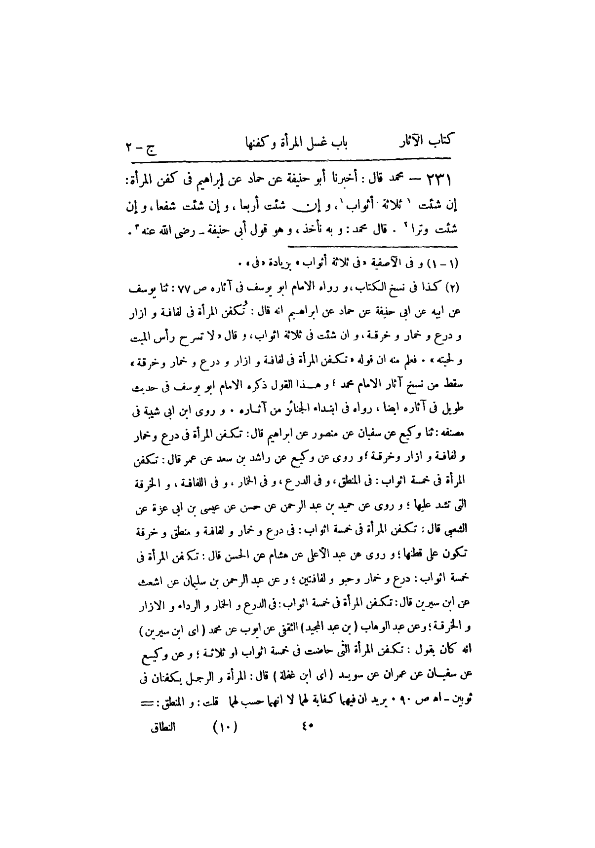 ٢٣١ - مُحَمَّدٌ، قَالَ: أَخْبَرَنَا أَبُو حَنِيفَةَ، عَنْ حَمَّادٍ، عَنْ إِبْرَاهِيمَ فِي كَفَنِ الْمَرْأَةِ: «إِنْ شِئْتَ ثَلَاثَةَ أَثْوَابٍ، وَإِنْ شِئْتَ أَرْبَعًا إِنْ شِئْتَ شَفْعًا وَإِنْ شِئْتَ وِتْرًا» قَالَ مُحَمَّدٌ: وَبِهِ نَأْخُذُ وَهُوَ قَوْلُ أَبِي حَنِيفَةَ رَضِيَ اللَّهُ عَنْهُ