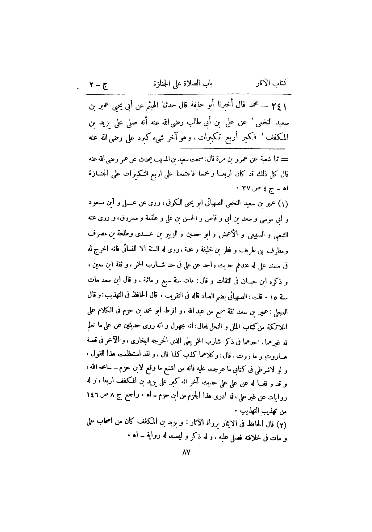 ٢٤١ - مُحَمَّدٌ، قَالَ: أَخْبَرَنَا أَبُو حَنِيفَةَ، قَالَ حَدَّثَنَا الْهَيْثَمُ، عَنْ أَبِي يَحْيَى عُمَيْرِ بْنِ سَعِيدٍ النَّخَعِيِّ عَنْ عَلِيِّ بْنِ أَبِي طَالِبٍ رَضِيَ اللَّهُ عَنْهُ «أَنَّهُ صَلَّى عَلَى يَزِيدَ بْنِ الْمُكَفَّفِ فَكَبَّرَ أَرْبَعَ تَكْبِيرَاتٍ» ، وَهُوَ آخِرُ شَيْءٍ كَبَّرَهُ عَلِيٌّ رَضِيَ اللَّهُ عَنْهُ ⦗٨٨⦘ عَلَى الْجَنَائِزِ