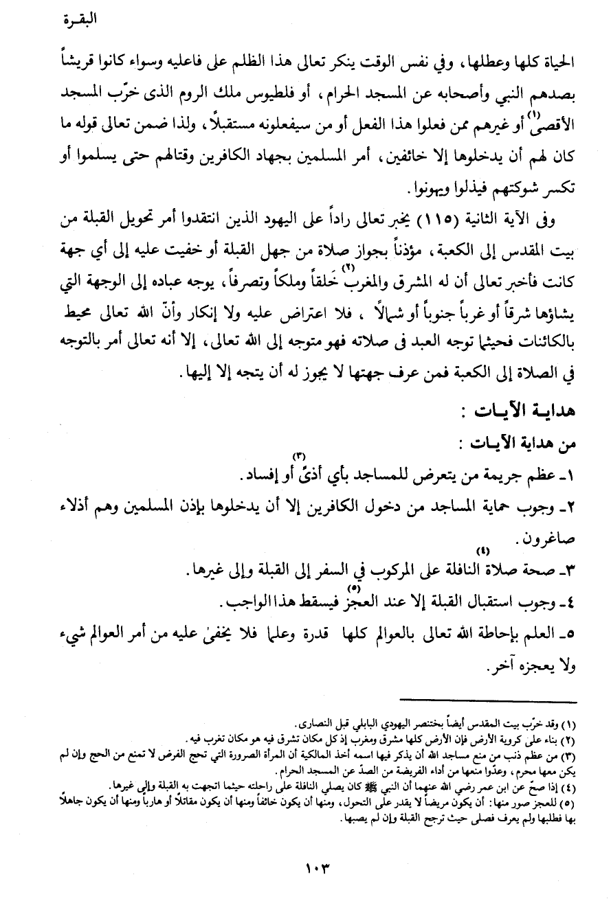 وفي الآية الثانية (115) يخبر تعالى راداً على اليهود الذين انتقدوا أمر تحويل القبلة من بين المقدس إلى الكعبة، مؤذناً بجواز صلاة من جهل القبلة أو خفيت عليه إلى أي جهة كانت، فأخبر تعالى أن له المشرق والمغرب2 خلفاً وملكاً وتصرفاً، يوجه عباده إلى الوجهة التي يشاؤها شرقاً أو غرباً، جنوباً أو شمالاً، فلا اعتراض ولا إنكار وأن الله تعالى محيط بالكائنات، فحيثما توجه العبد في صلاته فهو متوجه إلى الله تعالى، إلا أنه تعالى أمر بالتوجه في الصلاة إلى الكعبة بمن عرف جهتها لا يجوز له أن يتجه إلا إليها.