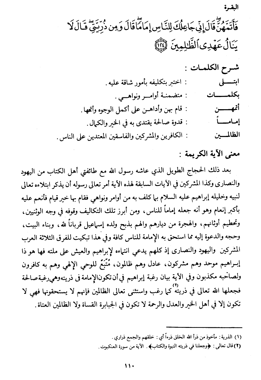 فَأَتَمَّهُنَّ قَالَ إِنِّي جَاعِلُكَ لِلنَّاسِ إِمَاماً قَالَ وَمِنْ ذُرِّيَّتِي قَالَ لا يَنَالُ عَهْدِي الظَّالِمِينَ (124) }