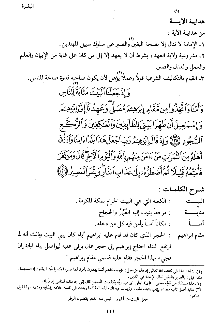 {وَإِذْ جَعَلْنَا الْبَيْتَ مَثَابَةً3 لِلنَّاسِ وَأَمْناً وَاتَّخِذُوا مِنْ مَقَامِ إِبْرَاهِيمَ مُصَلّىً وَعَهِدْنَا إِلَى إِبْرَاهِيمَ وَإِسْمَاعِيلَ أَنْ طَهِّرَا بَيْتِيَ لِلطَّائِفِينَ وَالْعَاكِفِينَ وَالرُّكَّعِ السُّجُودِ (125) وَإِذْ قَالَ إِبْرَاهِيمُ رَبِّ اجْعَلْ هَذَا بَلَداً آمِناً وَارْزُقْ أَهْلَهُ مِنَ الثَّمَرَاتِ مَنْ آمَنَ مِنْهُمْ بِاللهِ وَالْيَوْمِ الآخِرِ قَالَ وَمَنْ كَفَرَ فَأُمَتِّعُهُ قَلِيلاً ثُمَّ أَضْطَرُّهُ إِلَى عَذَابِ النَّارِ وَبِئْسَ الْمَصِيرُ (126) }