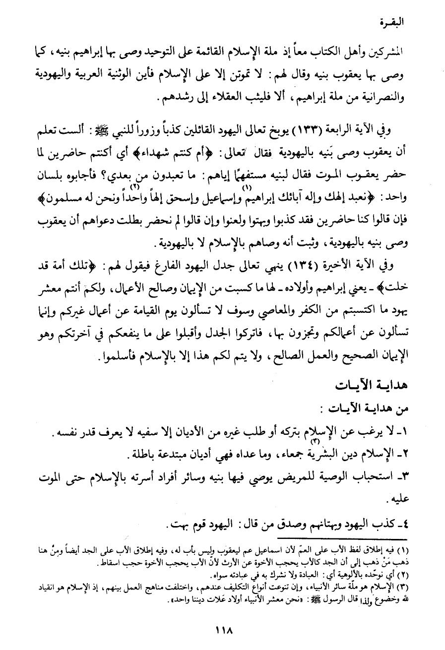 وفي الآية الرابعة (133) يوبخ تعالى اليهود القائلين كذباً وزوراً للنبي صَلَّى اللهُ عَلَيْهِ وَسَلَّمَ: ألست تعلم أن يعقوب وصى بنيه باليهودية، فقال تعالى: {أَمْ كُنْتُمْ شُهَدَاءَ} أي: كنتم حاضرين لما حضر يعقوب الموت فقال لبنيه مستفهماً إياهم: {مَا تَعْبُدُونَ مِنْ بَعْدِي} ؟ فأجابوه بلسان واحد: {نَعْبُدُ إِلَهَكَ وَإِلَهَ آبَائِكَ إِبْرَاهِيمَ1 وَإِسْمَاعِيلَ وَإِسْحَاقَ إِلَهاً وَاحِداً2 وَنَحْنُ لَهُ مُسْلِمُونَ} .