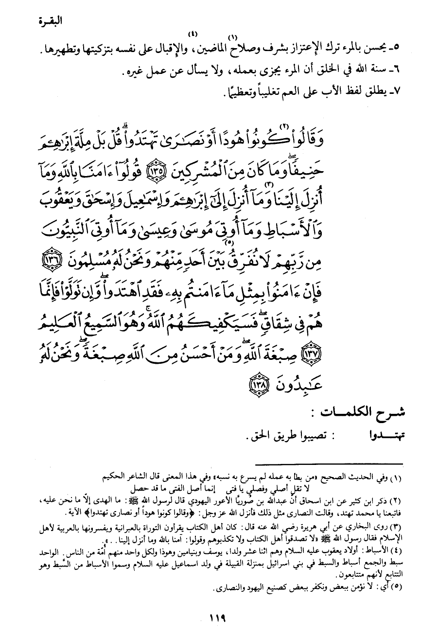 {وَقَالُوا3 كُونُوا هُوداً أَوْ نَصَارَى تَهْتَدُوا قُلْ بَلْ مِلَّةَ إِبْرَاهِيمَ حَنِيفاً وَمَا كَانَ مِنَ الْمُشْرِكِينَ (135) قُولُوا آمَنَّا بِاللهِ وَمَا أُنْزِلَ إِلَيْنَا4 وَمَا أُنْزِلَ إِلَى إِبْرَاهِيمَ وَإِسْمَاعِيلَ وَإِسْحَاقَ وَيَعْقُوبَ وَالأَسْبَاطِ وَمَا أُوتِيَ مُوسَى وَعِيسَى وَمَا أُوتِيَ النَّبِيُّونَ مِنْ رَبِّهِمْ لا نُفَرِّقُ5 بَيْنَ أَحَدٍ مِنْهُمْ وَنَحْنُ لَهُ مُسْلِمُونَ (136) فَإِنْ آمَنُوا بِمِثْلِ مَا آمَنْتُمْ بِهِ فَقَدِ اهْتَدَوْا وَإِنْ تَوَلَّوْا فَإِنَّمَا هُمْ فِي شِقَاقٍ فَسَيَكْفِيكَهُمُ اللهُ وَهُوَ السَّمِيعُ الْعَلِيمُ (137) صِبْغَةَ اللهِ وَمَنْ أَحْسَنُ مِنَ اللهِ صِبْغَةً وَنَحْنُ لَهُ عَابِدُونَ (138) }