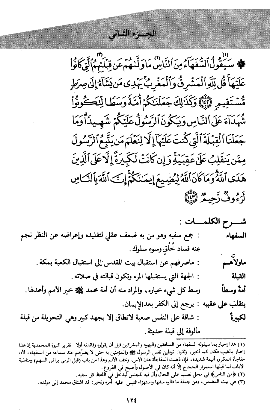 {سَيَقُولُ1 السُّفَهَاءُ مِنَ النَّاسِ2 مَا وَلاهُمْ عَنْ قِبْلَتِهِمُ3 الَّتِي كَانُوا عَلَيْهَا قُلْ لِلَّهِ الْمَشْرِقُ وَالْمَغْرِبُ يَهْدِي مَنْ يَشَاءُ إِلَى صِرَاطٍ مُسْتَقِيمٍ (142) وَكَذَلِكَ جَعَلْنَاكُمْ أُمَّةً وَسَطاً لِتَكُونُوا شُهَدَاءَ عَلَى النَّاسِ وَيَكُونَ الرَّسُولُ عَلَيْكُمْ شَهِيداً وَمَا جَعَلْنَا الْقِبْلَةَ الَّتِي كُنْتَ عَلَيْهَا إِلا لِنَعْلَمَ مَنْ يَتَّبِعُ الرَّسُولَ مِمَّنْ يَنْقَلِبُ عَلَى عَقِبَيْهِ وَإِنْ كَانَتْ لَكَبِيرَةً إِلا عَلَى الَّذِينَ هَدَى اللهُ وَمَا كَانَ اللهُ لِيُضِيعَ إِيمَانَكُمْ إِنَّ اللهَ بِالنَّاسِ لَرَؤُوفٌ رَحِيمٌ (143) }