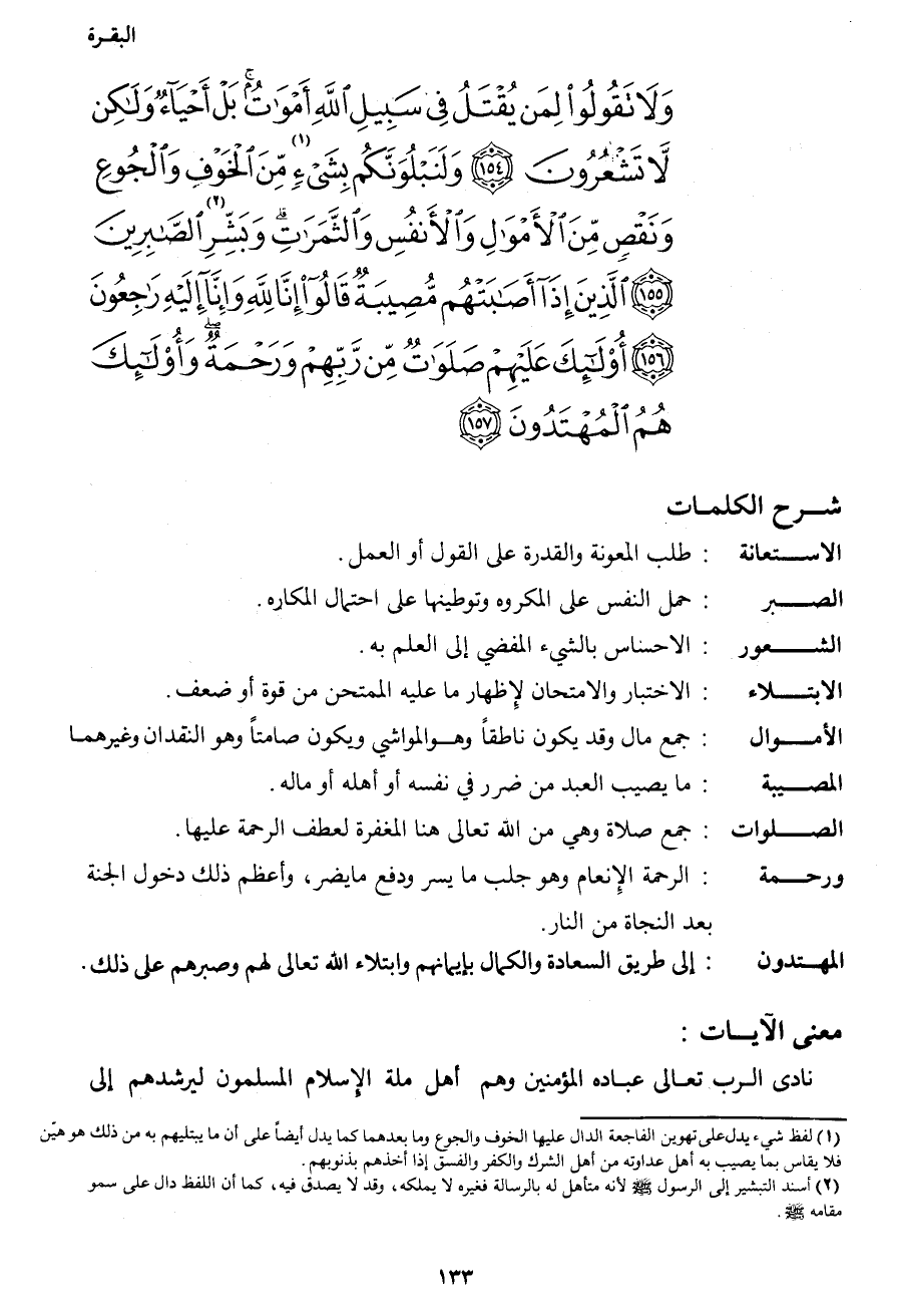{وَلا تَقُولُوا لِمَنْ يُقْتَلُ فِي سَبِيلِ اللهِ أَمْوَاتٌ بَلْ أَحْيَاءٌ وَلَكِنْ لا تَشْعُرُونَ (154) وَلَنَبْلُوَنَّكُمْ بِشَيْءٍ1 مِنَ الْخَوْفِ وَالْجُوعِ وَنَقْصٍ مِنَ الْأَمْوَالِ وَالْأَنْفُسِ وَالثَّمَرَاتِ وَبَشِّرِ2 الصَّابِرِينَ (155) الَّذِينَ إِذَا أَصَابَتْهُمْ مُصِيبَةٌ قَالُوا إِنَّا لِلَّهِ وَإِنَّا إِلَيْهِ رَاجِعُونَ (156) أُولَئِكَ عَلَيْهِمْ صَلَوَاتٌ مِنْ رَبِّهِمْ وَرَحْمَةٌ وَأُولَئِكَ هُمُ الْمُهْتَدُونَ (157) }