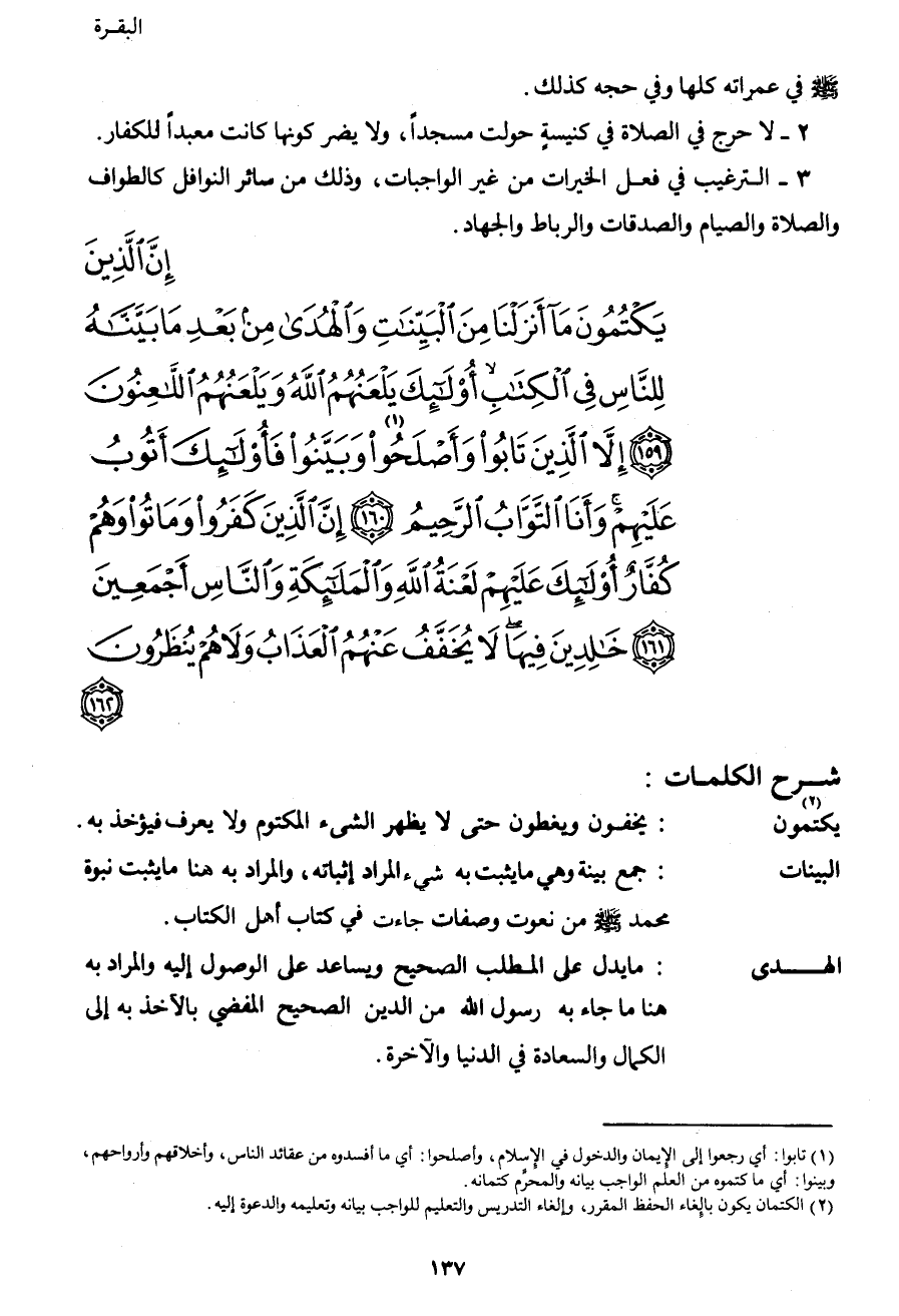 {إِنَّ الَّذِينَ يَكْتُمُونَ مَا أَنْزَلْنَا مِنَ الْبَيِّنَاتِ وَالْهُدَى مِنْ بَعْدِ مَا بَيَّنَّاهُ لِلنَّاسِ فِي الْكِتَابِ أُولَئِكَ يَلْعَنُهُمُ اللهُ وَيَلْعَنُهُمُ اللاعِنُونَ (159) إِلا الَّذِينَ تَابُوا وَأَصْلَحُوا1 وَبَيَّنُوا فَأُولَئِكَ أَتُوبُ عَلَيْهِمْ وَأَنَا التَّوَّابُ الرَّحِيمُ (160) إِنَّ الَّذِينَ كَفَرُوا وَمَاتُوا وَهُمْ كُفَّارٌ أُولَئِكَ عَلَيْهِمْ لَعْنَةُ اللهِ وَالْمَلائِكَةِ وَالنَّاسِ أَجْمَعِينَ (161) خَالِدِينَ فِيهَا لا يُخَفَّفُ عَنْهُمُ الْعَذَابُ وَلا هُمْ يُنْظَرُونَ (162) }