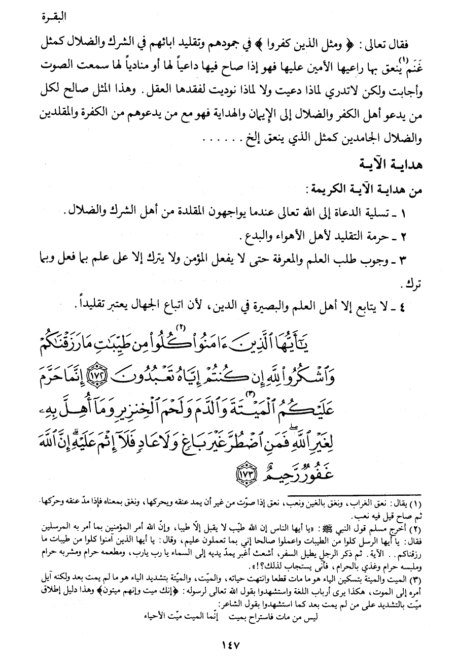 {يَا أَيُّهَا الَّذِينَ آمَنُوا كُلُوا2 مِنْ طَيِّبَاتِ مَا رَزَقْنَاكُمْ وَاشْكُرُوا لِلَّهِ إِنْ كُنْتُمْ إِيَّاهُ تَعْبُدُونَ (172) إِنَّمَا حَرَّمَ عَلَيْكُمُ الْمَيْتَةَ3 وَالدَّمَ وَلَحْمَ الْخِنْزِيرِ وَمَا أُهِلَّ بِهِ لِغَيْرِ اللهِ فَمَنِ اضْطُرَّ غَيْرَ بَاغٍ وَلا عَادٍ فَلا إِثْمَ عَلَيْهِ إِنَّ اللهَ غَفُورٌ رَحِيمٌ (173) }