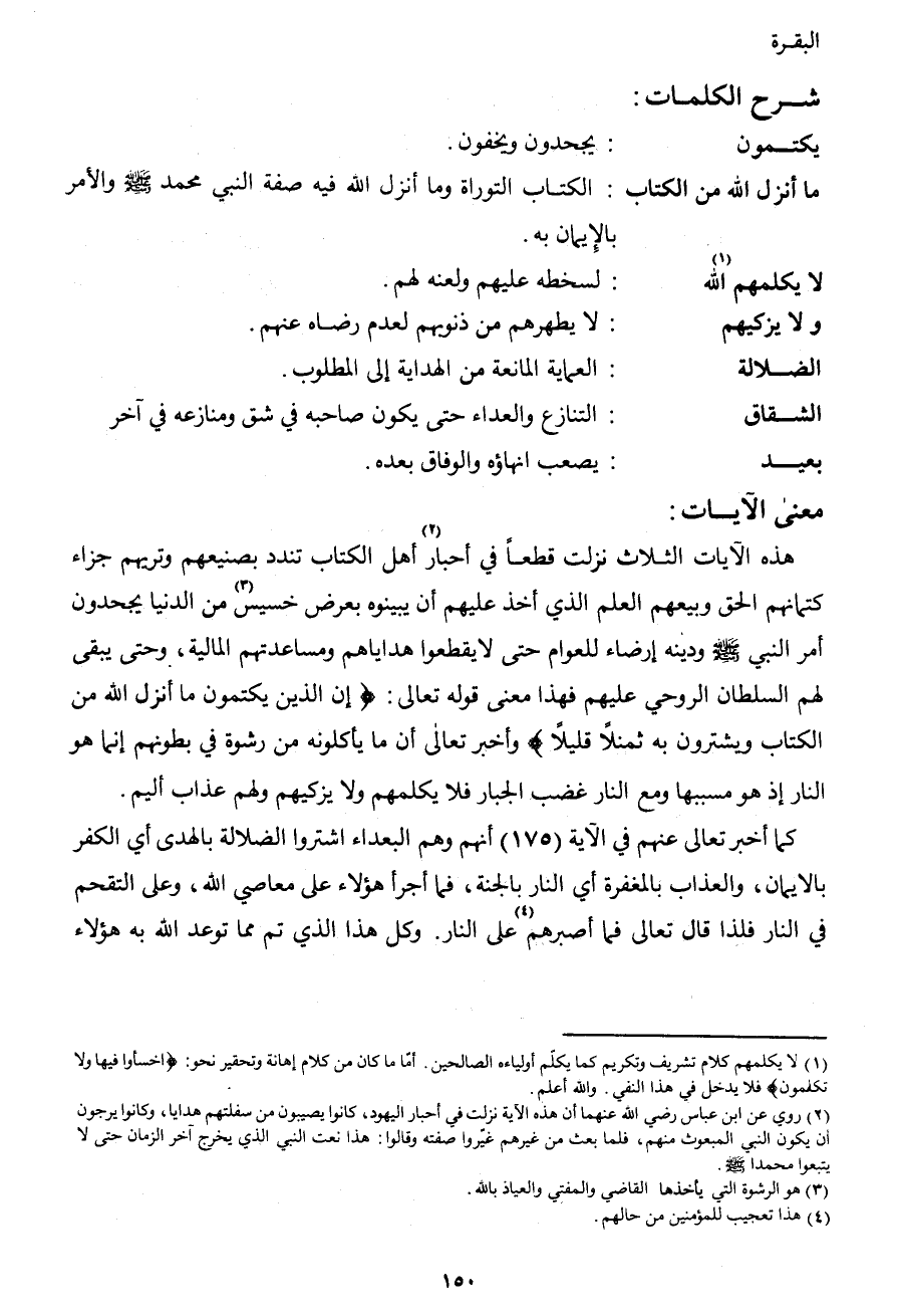 هذه الآيات الثلاث نزلت قطعاً في أحبار2 أهل الكتاب تندد بصنيعهم وتريهم جزاء كتمانهم الحق وبيعهم العلم الذي أخذ عليهم أن يبينوه بعرض خسيس3 من الدنيا يجحدون أمر النبي صَلَّى اللهُ عَلَيْهِ وَسَلَّمَ ودينه إرضاء للعوام حتى لا يقطعوا هداياهم ومساعدتهم المالية، وحتى يبقى لهم السلطان الروحي عليهم، فهذا معنى قوله تعالى: {إِنَّ الَّذِينَ يَكْتُمُونَ مَا أَنْزَلَ اللهُ مِنَ الْكِتَابِ وَيَشْتَرُونَ بِهِ ثَمَناً قَلِيلاً} ، وأخبر تعالى أن ما يأكلونه من رشوة في بطونهم إنما هو النار إذ هو مسببها ومع النار غضب الجبار فلا يكلمهم ولا يزكيهم ولهم عذاب أليم.