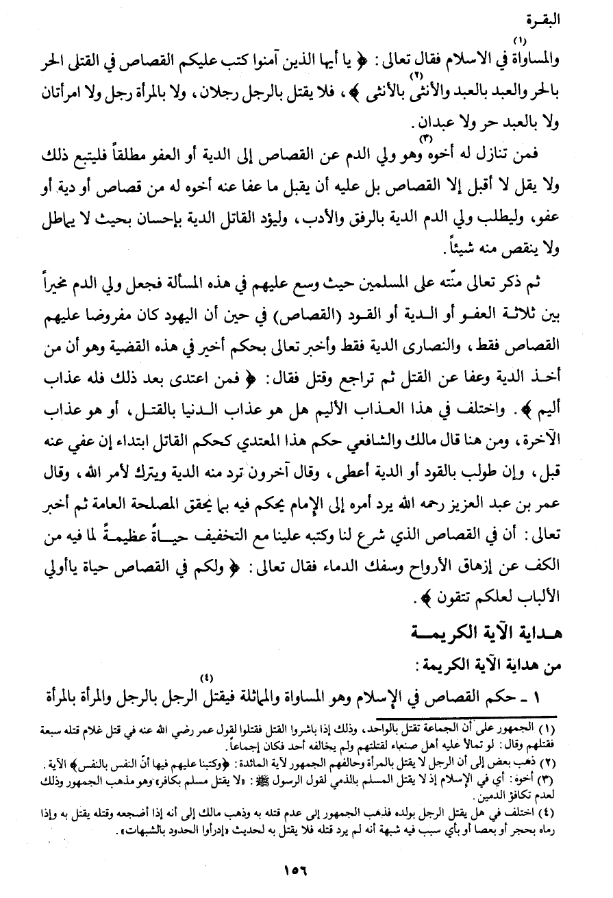 2 ذهب بعض إلى أن الرجل لا يقتل بالمرأة وحالفهم الجمهور لآية المائددة: {وَكَتَبْنَا عَلَيْهِمْ فِيهَا أَنَّ النَّفْسَ بِالنَّفْسِ} الآية.