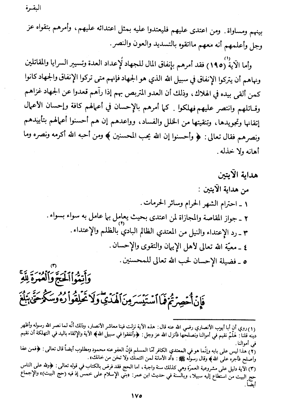 وأما الآية1 (195) فقد أمرهم بإنفاق المال للجهاد لإعداد العدة وتسيير السرايا ولمقاتلين ونهاهم أن يتركوا الإنفاق في سبيل الله الذي هو الجهاد فإنهم متى تركوا الإنفاق والجهاد كانوا كمن ألقى بيده في الهلاك، وذلك أن العدو المتربص بهم إذا رآهم قعدوا عن الجهاد غزاهم وقاتلهم وانتصر عليهم فهلكوا. كما أمرهم بالإحسان في أعمالهم كافة وإحسان الأعمال إتقانها وتجويدها، وتنقيتها من الخلل والفساد، وواعدهم إن هم أحسنوا أعمالهم بتأييدهم ونصرهم، فقال تعالى: {وَأَحْسِنُوا إِنَّ اللهَ يُحِبُّ الْمُحْسِنِينَ} ومن أحبه الله أكرمه ونصره وما أهانه ولا خذله.