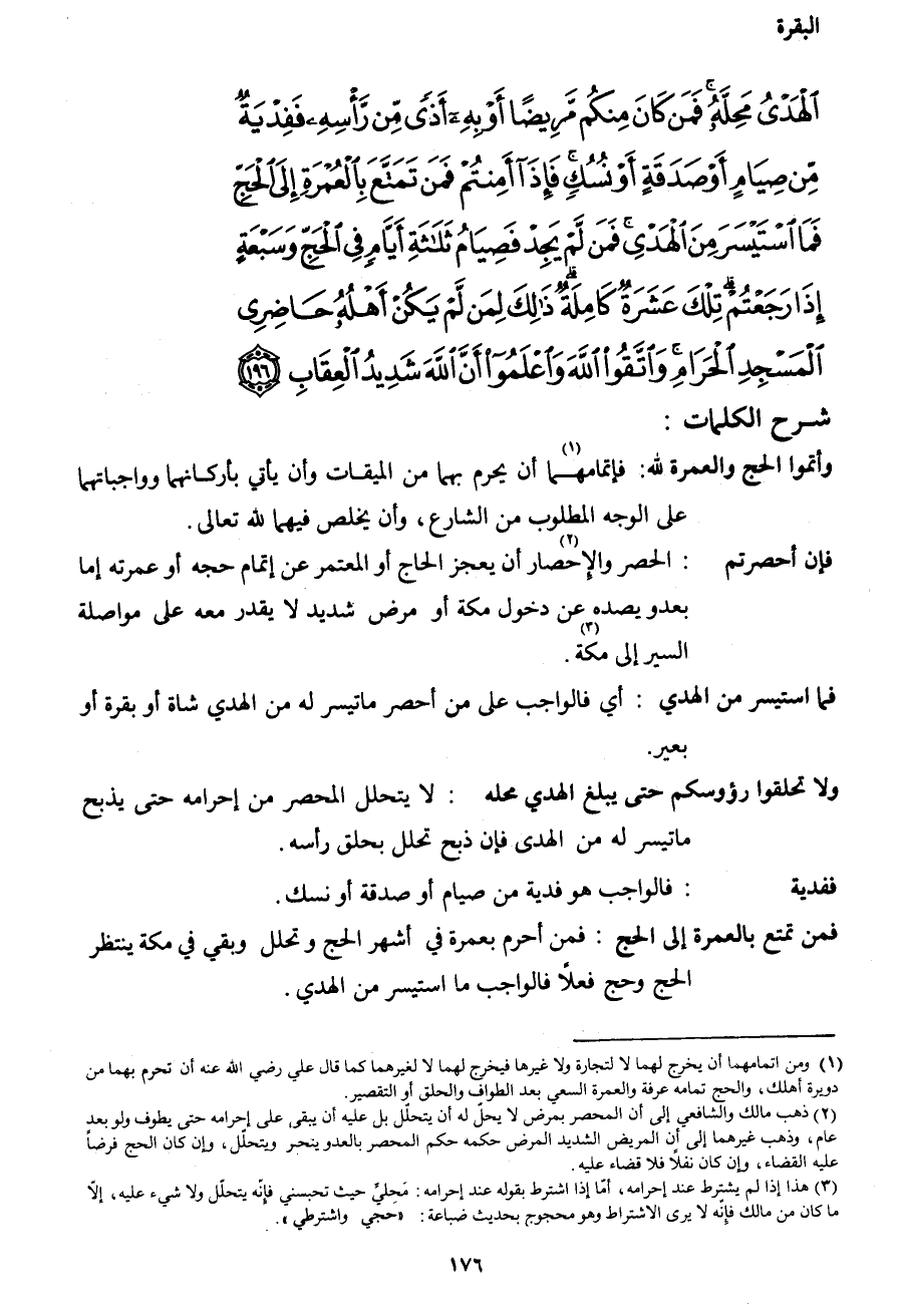 الْهَدْيُ مَحِلَّهُ فَمَنْ كَانَ مِنْكُمْ مَرِيضاً أَوْ بِهِ أَذىً مِنْ رَأْسِهِ فَفِدْيَةٌ مِنْ صِيَامٍ أَوْ صَدَقَةٍ أَوْ نُسُكٍ فَإِذَا أَمِنْتُمْ فَمَنْ تَمَتَّعَ بِالْعُمْرَةِ إِلَى الْحَجِّ فَمَا اسْتَيْسَرَ مِنَ الْهَدْيِ فَمَنْ لَمْ يَجِدْ فَصِيَامُ ثَلاثَةِ أَيَّامٍ فِي الْحَجِّ وَسَبْعَةٍ إِذَا رَجَعْتُمْ تِلْكَ عَشَرَةٌ كَامِلَةٌ ذَلِكَ لِمَنْ لَمْ يَكُنْ أَهْلُهُ حَاضِرِي الْمَسْجِدِ الْحَرَامِ وَاتَّقُوا اللهَ وَاعْلَمُوا أَنَّ اللهَ شَدِيدُ الْعِقَابِ (196) }