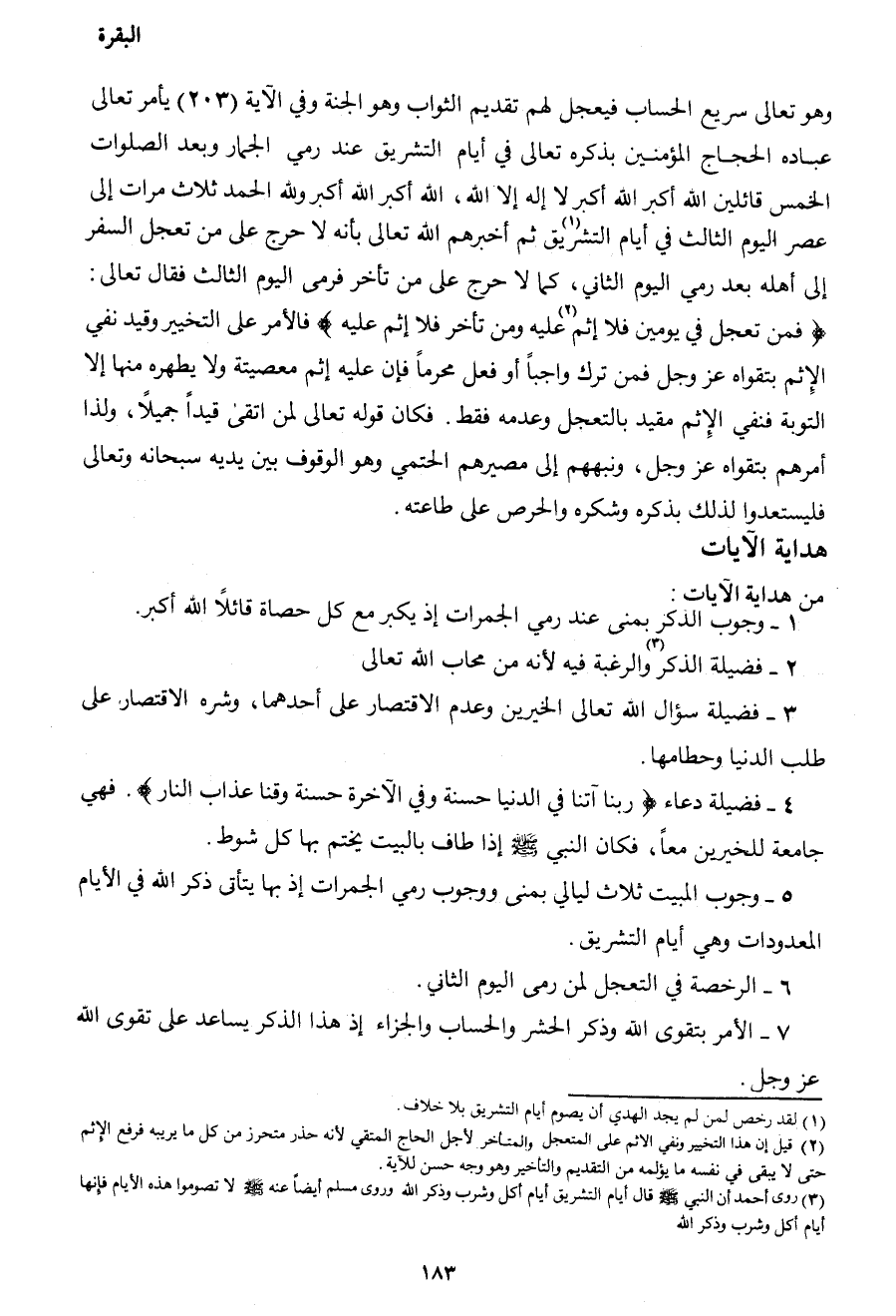 وهو تعالى سريع الحساب فيعجل لهم تقديم الثواب وهو الجنة، وفي الآية (203) يأمر تعالى عباده الحجاج المؤمنين بذكره تعالى في أيام التشريق عند رمي الجمار وبعد الصلوات الخمس قائلين: الله أكبر الله أكبر لا إله إلا الله، الله أكبر ألله أكبر ولله الحمد ثلاث مرات إلى عصر اليوم الثالث في أيام التشريق1 ثم أخبرهم الله تعالى بأنه لا حرج على من تعجل السفر إلى أهله بعد رمي اليوم الثاني، كما لا حرج على من تأخر فرمى اليوم الثالث فقال تعالى: {فَمَنْ تَعَجَّلَ فِي يَوْمَيْنِ فَلا إِثْمَ2 عَلَيْهِ وَمَنْ تَأَخَّرَ فَلا إِثْمَ عَلَيْهِ} فالأمر على التخيير وقيد نفي الإثم بتقواه عز وجل فمن ترك واجباً أو فعل محرماً فإن عليه إثم معصيته ولا يطهره منها إلا التوبة ففي الإثم مقيد بالتعجل ودعمه فقط. فكان قوله تعالى لمن اتقى قيدا ً جميلاً، ولذا أمرهم بتقواه عز وجل، ونبههم إلى مصيرهم الحتمي، وهو الوقوف بين يديه سبحانه وتعالى، فليستعدوا لذلك بذكره وشكره والحرص على طاعته.