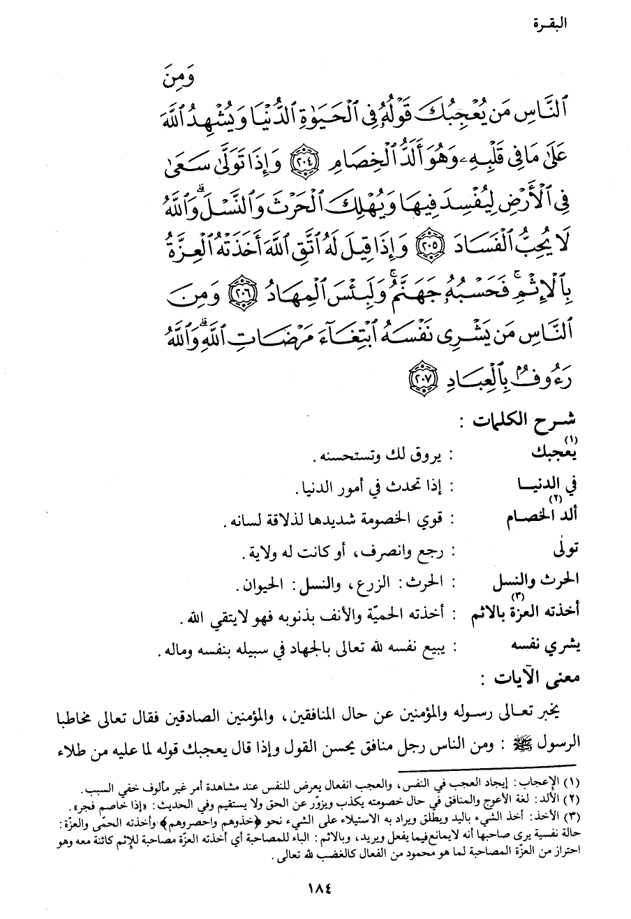 {وَمِنَ النَّاسِ مَنْ يُعْجِبُكَ قَوْلُهُ فِي الْحَيَاةِ الدُّنْيَا وَيُشْهِدُ اللهَ عَلَى مَا فِي قَلْبِهِ وَهُوَ أَلَدُّ الْخِصَامِ (204) وَإِذَا تَوَلَّى سَعَى فِي الأَرْضِ لِيُفْسِدَ فِيهَا وَيُهْلِكَ الْحَرْثَ وَالنَّسْلَ وَاللهُ لا يُحِبُّ الْفَسَادَ (205) وَإِذَا قِيلَ لَهُ اتَّقِ اللهَ أَخَذَتْهُ الْعِزَّةُ بِالأِثْمِ فَحَسْبُهُ جَهَنَّمُ وَلَبِئْسَ الْمِهَادُ (206) وَمِنَ النَّاسِ مَنْ يَشْرِي نَفْسَهُ ابْتِغَاءَ مَرْضَاتِ اللهِ وَاللهُ رَؤُوفٌ بِالْعِبَادِ (207) }