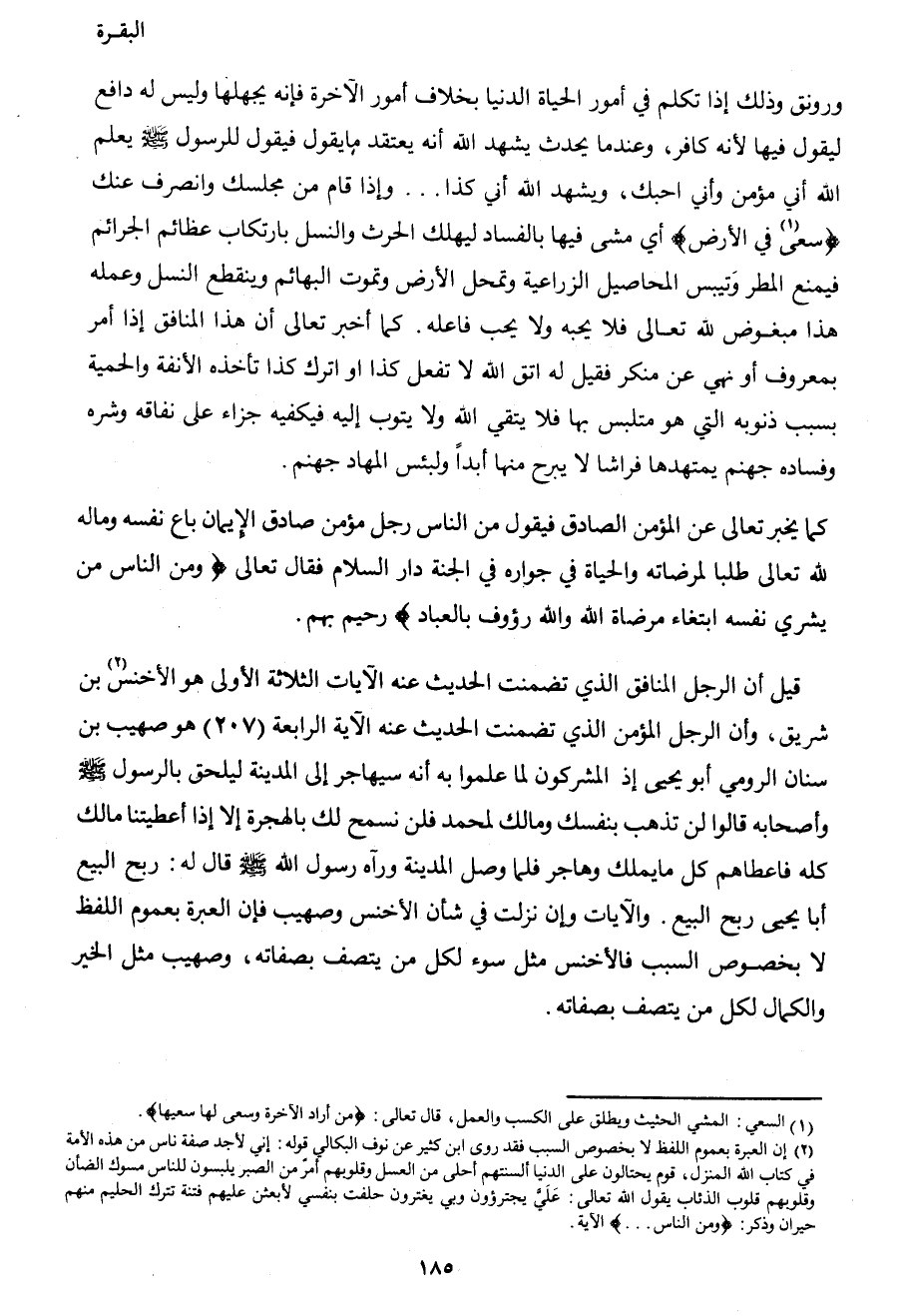 قيل: أن الرجل المنافق الذي تضمنت الحديث عنه الآيات الثلاثة الأولى: هو الأخنس2 بن شريق، وأن الرجل المؤمن الذي تضمنت الحديث عنه الآية الرابعة (207) هو: صهيب بن سنان الرومي أبو يحي، إذ المشركون لما علموا به أنه سيهاجر إلى المدينة ليلحق بالرسول صَلَّى اللهُ عَلَيْهِ وَسَلَّمَ وأصحابه قالوا: لن تذهب بنفسك ومالك لمحمد، فلن نسمح لك بالهجرة إلا إذا أعطيتنا مالك كله، فأعطاهم كل ما يملك وهاجر فلما وصل المدينة، ورآه رسول الله صَلَّى اللهُ عَلَيْهِ وَسَلَّمَ قال له: ربح البيع أبا يحي ربح البيع. والآيات وإن نزلت في شأن الأخنس وصهيب فإن العبرة بعموم اللفظ لا بخصوص السبب، فالأخنس مثل سوء لكل من يتصف بصفاته، وصيب مثل الخير والكمال لكل من يتصف بصفاته.