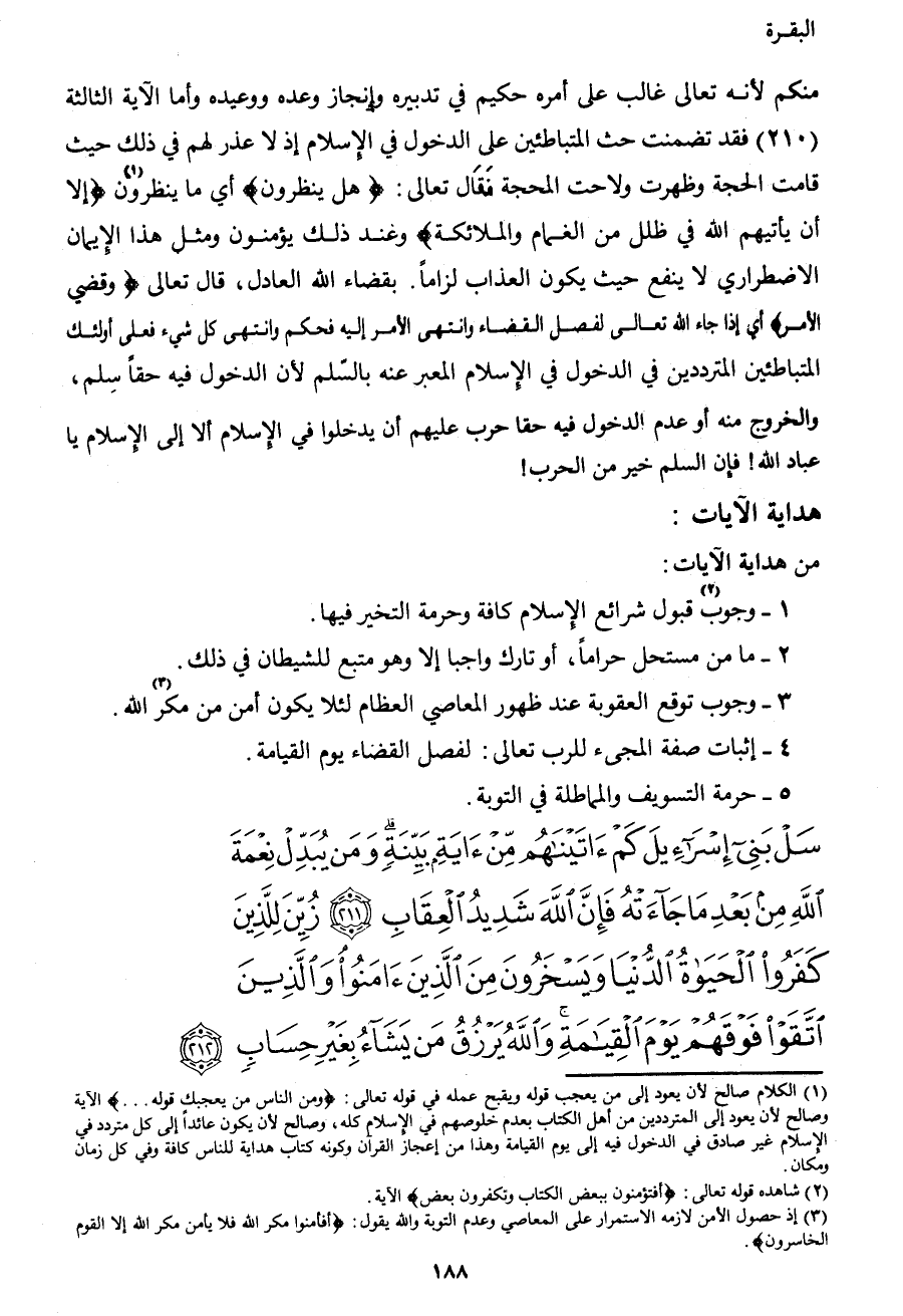 منكم؛ لأنه تعالى غالب على أمره حكيم في تدبيره وإنجاز وعده ووعيد، وأما الآية الثالثة (210) فقد تضمنت حث المتباطئين على الدخول في الإسلام، إذ لا عذر لهم في ذلك حيث قامت الحجة وظهرت ولاحت الحجة، فقال تعالى: {هَلْ يَنْظُرُونَ} أي: ما ينظرون1 {إِلا أَنْ يَأْتِيَهُمُ اللهُ فِي ظُلَلٍ مِنَ الْغَمَامِ وَالْمَلائِكَة} ُ وعند ذلك يؤمنون، ومثل هذا الإيمان الاضطراري لا ينفع حيث يكون العذاب لزاماً. بقضاء الله العادل، قال تعالى: {وَقُضِيَ الأَمْرُ} إذا جاء الله تعالى لفصل القضاء وانتهى الأمر إليه فحكم وانتهى كل شيء، فعلى أولئك المتباطئين المترددين في الدخول في الإسلام المعبر عنه بالسلم؛ لأن الدخول فيه حقاً سلم، والخروج منه أو عدم الدخول فيه حقاً حرب عليهم أن يدخلوا في الإسلام ألا إلى الإسلام يا عباد الله! فإن السلم خير من الحرب!.