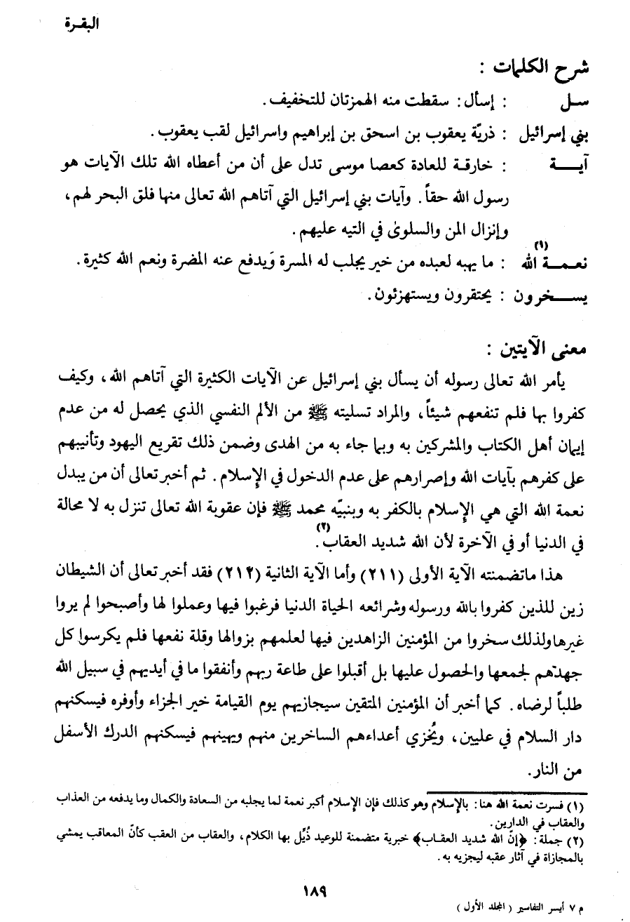 يأمر الله تعالى رسوله أن يسأل بني إسرائيل عن الآيات الكثيرة التي آتاهم الله، وكيف كفروا بها فلم تنفعهم شيئاً، والمراد تسليته صَلَّى اللهُ عَلَيْهِ وَسَلَّمَ من الألم النفسي الذي يحصل له من عدم إيمان أهل الكتاب والمشركين به وبما جاء به من الهدى وضمن ذلك تقريع اليهود وتأنيبهم على كفرهم بآيات الله وإصرارهم على عدم الدخول في الإسلام. ثم أخبر تعالى أن من يبدل نعمة الله التي هي الإسلام بالكفر به ونبيه محمد صَلَّى اللهُ عَلَيْهِ وَسَلَّمَ فإن عقوبة الله تعالى تنزل به لا محالة في الدنيا أو في الآخرة لأن الله شديد العقاب2.