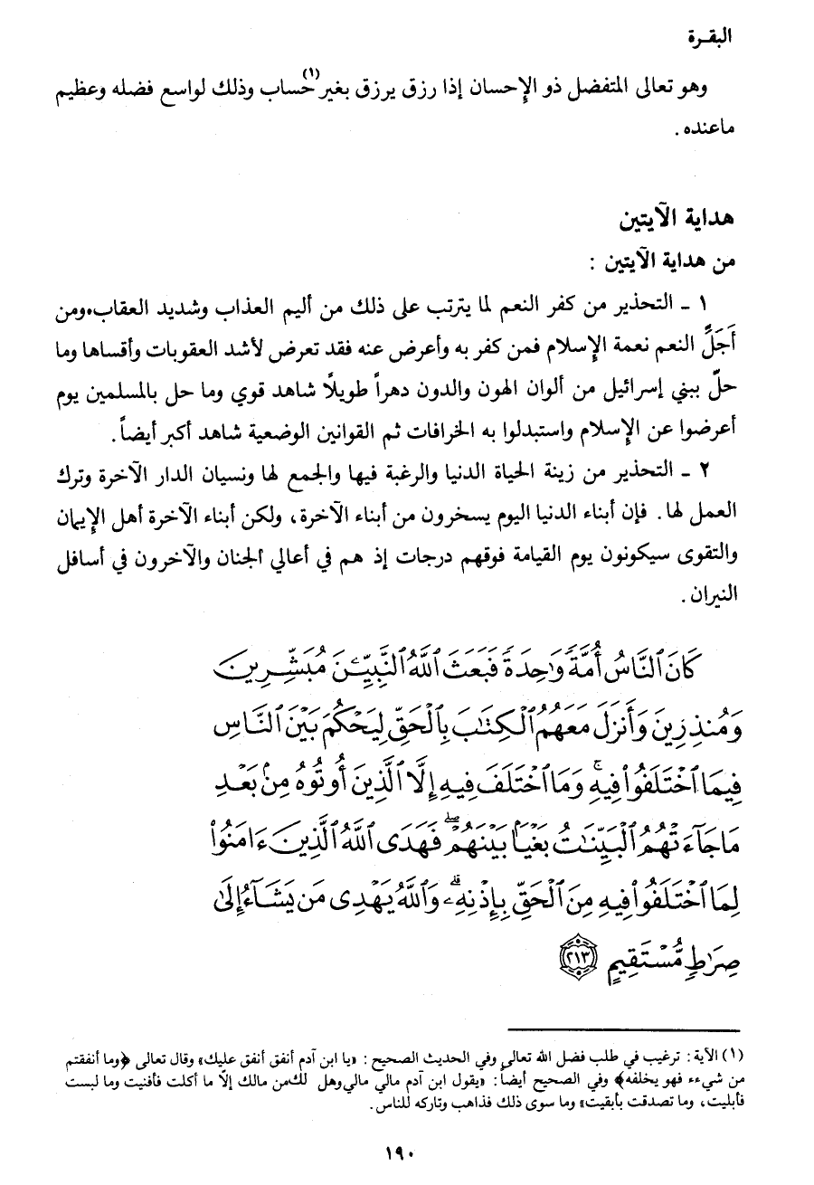 {كَانَ النَّاسُ أُمَّةً وَاحِدَةً فَبَعَثَ اللهُ النَّبِيِّينَ مُبَشِّرِينَ وَمُنْذِرِينَ وَأَنْزَلَ مَعَهُمُ الْكِتَابَ بِالْحَقِّ لِيَحْكُمَ بَيْنَ النَّاسِ فِيمَا اخْتَلَفُوا فِيهِ وَمَا اخْتَلَفَ فِيهِ إِلا الَّذِينَ أُوتُوهُ مِنْ بَعْدِ مَا جَاءَتْهُمُ الْبَيِّنَاتُ بَغْياً بَيْنَهُمْ فَهَدَى اللهُ الَّذِينَ آمَنُوا لِمَا اخْتَلَفُوا فِيهِ مِنَ الْحَقِّ بِإِذْنِهِ وَاللهُ يَهْدِي مَنْ يَشَاءُ إِلَى صِرَاطٍ مُسْتَقِيمٍ (213) }