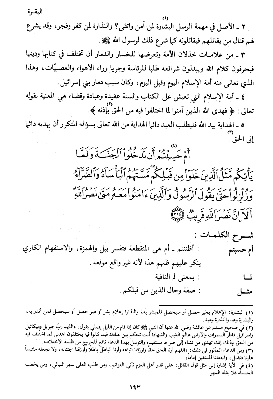 {أَمْ حَسِبْتُمْ4 أَنْ تَدْخُلُوا الْجَنَّةَ وَلَمَّا يَأْتِكُمْ مَثَلُ الَّذِينَ خَلَوْا مِنْ قَبْلِكُمْ مَسَّتْهُمُ الْبَأْسَاءُ وَالضَّرَّاءُ وَزُلْزِلُوا حَتَّى يَقُولَ الرَّسُولُ وَالَّذِينَ آمَنُوا مَعَهُ مَتَى نَصْرُ اللهِ أَلا إِنَّ نَصْرَ اللهِ قَرِيبٌ (214) }