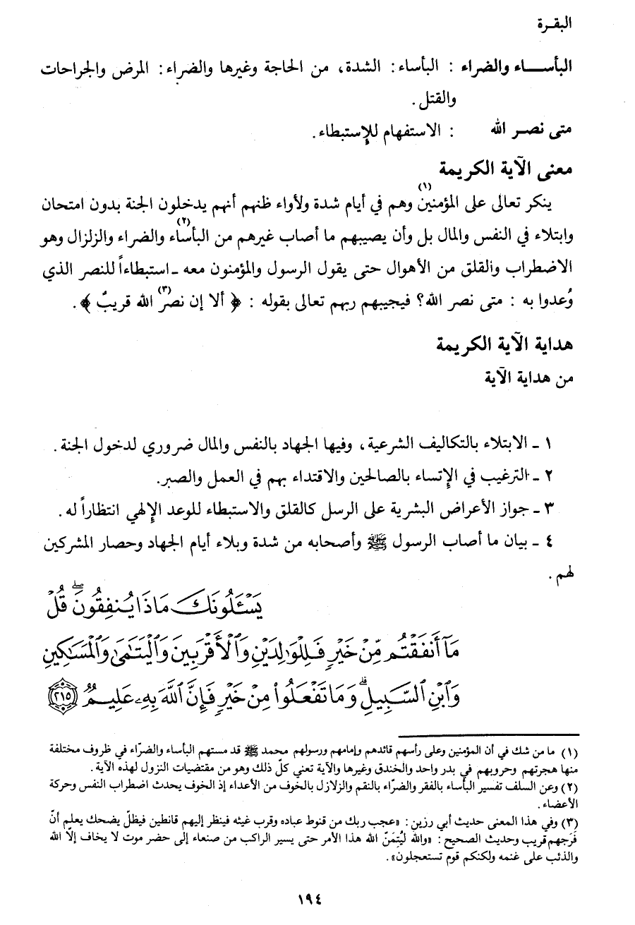 1 ما من شك في أن المؤمنين وعلى رأسهم وقائدهم وإمامهم ورسولهم محمد صَلَّى اللهُ عَلَيْهِ وَسَلَّمَ قد مستهم البأساء والضراء في ظروف مختلفة منها: هجرتهم وحروبهم في بدر وأحد والخندق وغيرها، والآية تعنى كل ذلك وهو من مقتضيات النزول لهذه الآية.