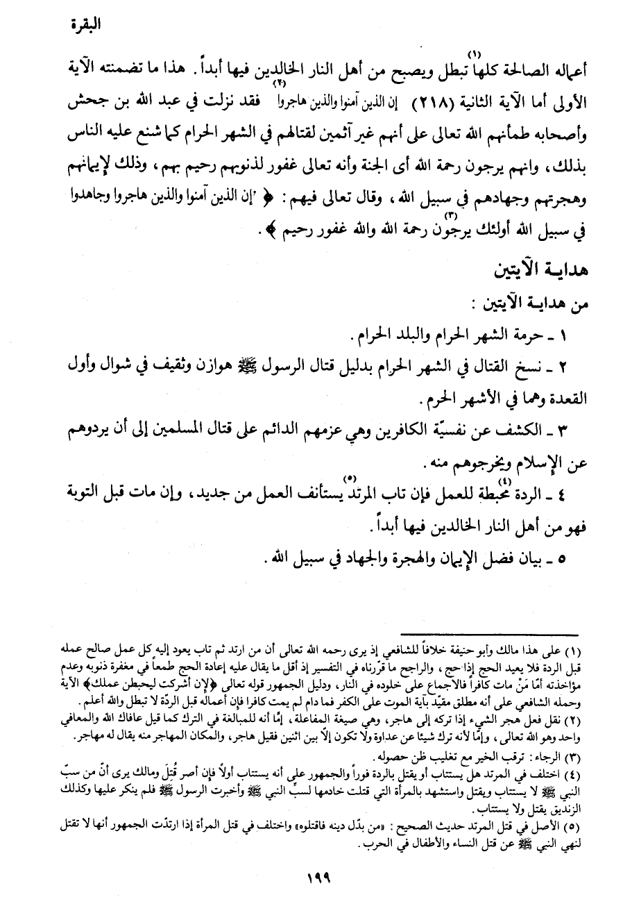 أعماله الصالحة كلها1 تبطل ويصبح من أهل النار الخالدين فيها أبداً. هذا ما تضمنته الآية الأولى، أما الآية الثانية (218) {إِنَّ الَّذِينَ آمَنُوا وَالَّذِينَ هَاجَرُوا2} فقد نزلت في عبد الله بن جحش وأصحابه طمأنهم الله تعالى على أنهم غير آثمين لقتالهم في الشهر الحرام كما شنع عليهم الناس بذلك، وأنه يرجون رحمة الله أي الجنة وأنه تعالى غفور لذنوبهم رحيم بهم، وذلك لإيمانهم وهجرتهم وجهادهم في سبيل الله، وقال تعالى فيهم: {إِنَّ الَّذِينَ آمَنُوا وَالَّذِينَ هَاجَرُوا وَجَاهَدُوا فِي سَبِيلِ اللهِ أُولَئِكَ يَرْجُونَ3 رَحْمَتَ اللهِ وَاللهُ غَفُورٌ رَحِيمٌ}