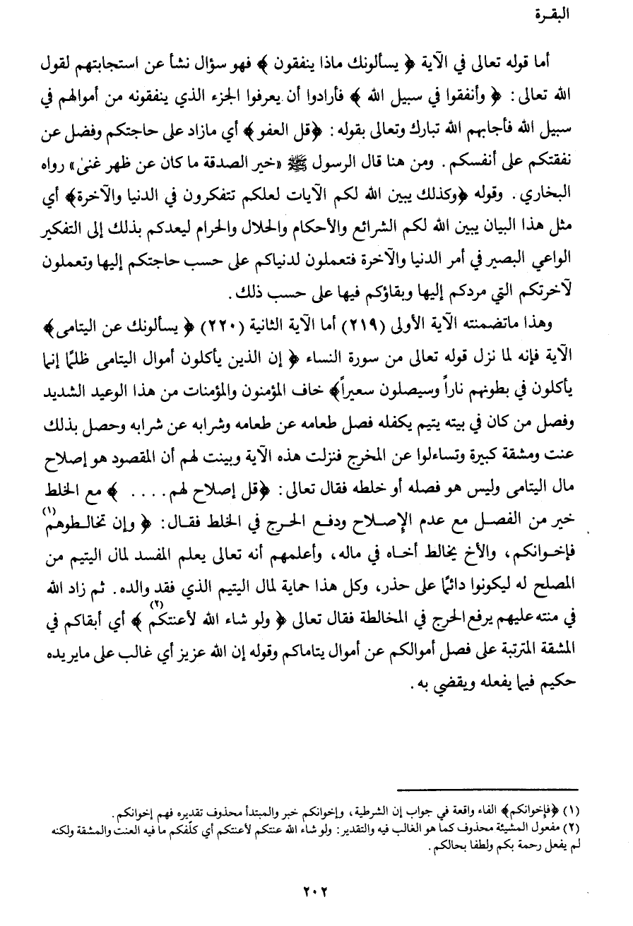 أما قوله تعالى في الآية: {وَيَسْأَلونَكَ مَاذَا يُنْفِقُونَ} فهو سؤال نشأ عن استجابتهم لقول الله تعالى: {وَأَنْفِقُوا فِي سَبِيلِ اللهِ} فأرادوا أن يعرفوا الجزء الذي ينفقونه من أموالهم في سبيل الله. فأجابهم الله تبارك وتعالى بقوله: {قُلِ الْعَفْوَ} أي: ما زاد على حاجتكم وفضل عن نفقتكم على أنفسكم. ومن هنا قال الرسول صَلَّى اللهُ عَلَيْهِ وَسَلَّمَ: "خير الصدقة ما كان عن ظهر غنى" رواه البخاري. وقوله: {كَذَلِكَ يُبَيِّنُ اللهُ لَكُمُ الآياتِ لَعَلَّكُمْ تَتَفَكَّرُونَ، فِي الدُّنْيَا وَالآخِرَةِ} أي: مثل هذا البيان يبين الله لكم الشرائع والأحكام والحلال ليعدكم بذلك إلى التفكير الواعي البصير في أمر الدنيا والآخرة فتعملون لدنياكم على حسب حاجتكم إليها وتعملون لآخرتكم التي مردكم إليها وبقاؤكم فيها على حسب ذلك.