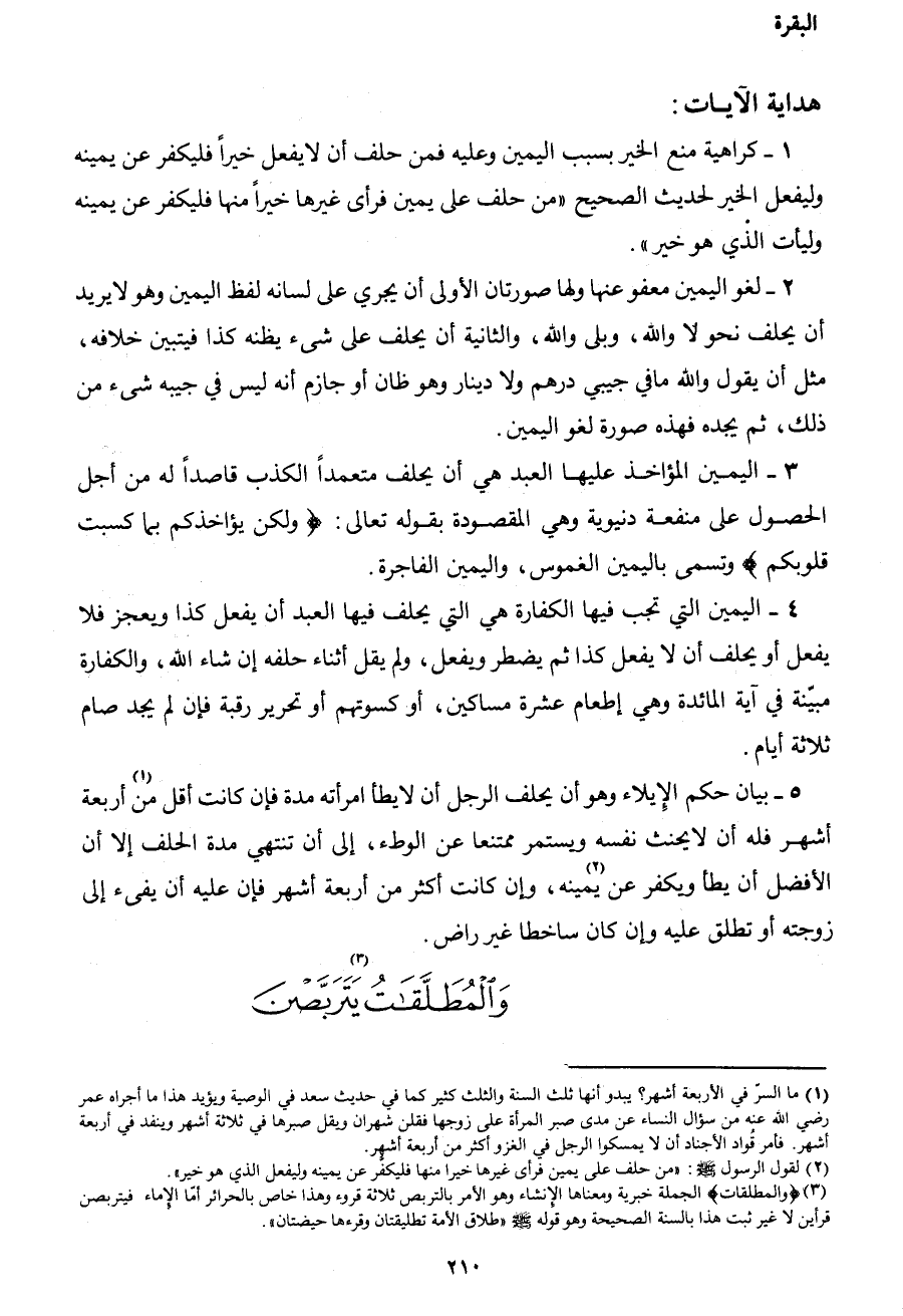 5- بيان حكم الإيلاء، وهو أن يحلف الرجل أن لا يطأ امرأته مدة فإن كانت أقل من1 أربعة أشهر فله أن لا يحنث نفسه ويستمر ممتنعاً عن الوطء، إلى أن تنتهي مدة الحلف إلا أن الأفضل أن يطأ ويكفر عن2 يمينه، وإن كانت أكثر من أربعة أشهر فإن عليه أن يفئ إلى زوجته أو تطلق عليه وإن كان ساخطاً غير راض.