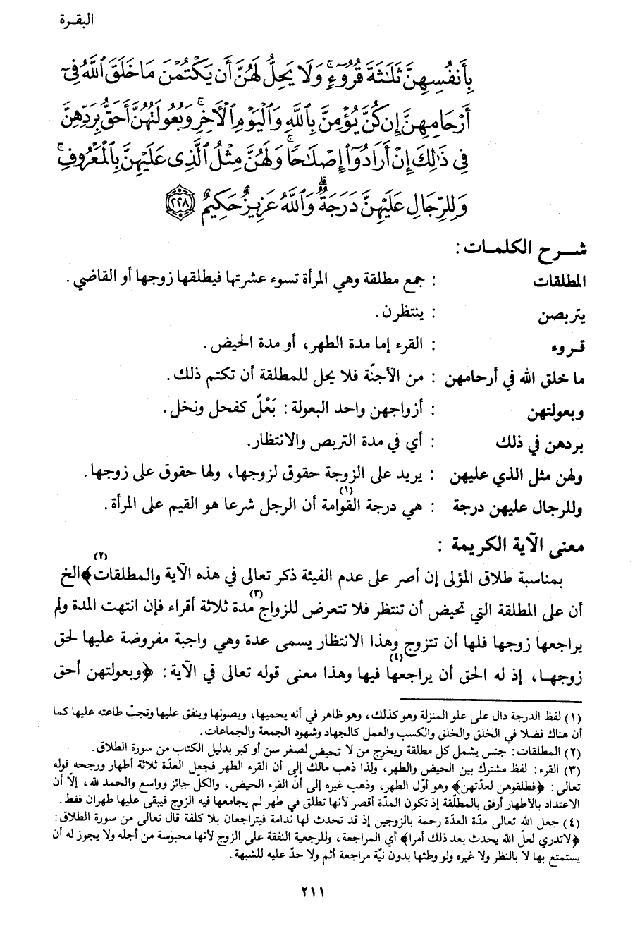 بِأَنْفُسِهِنَّ ثَلاثَةَ قُرُوءٍ وَلا يَحِلُّ لَهُنَّ أَنْ يَكْتُمْنَ مَا خَلَقَ اللهُ فِي أَرْحَامِهِنَّ إِنْ كُنَّ يُؤْمِنَّ بِاللهِ وَالْيَوْمِ الآخِرِ وَبُعُولَتُهُنَّ أَحَقُّ بِرَدِّهِنَّ فِي ذَلِكَ إِنْ أَرَادُوا إِصْلاحاً وَلَهُنَّ مِثْلُ الَّذِي عَلَيْهِنَّ بِالْمَعْرُوفِ وَلِلرِّجَالِ عَلَيْهِنَّ دَرَجَةٌ وَاللهُ عَزِيزٌ حَكِيمٌ (228) }