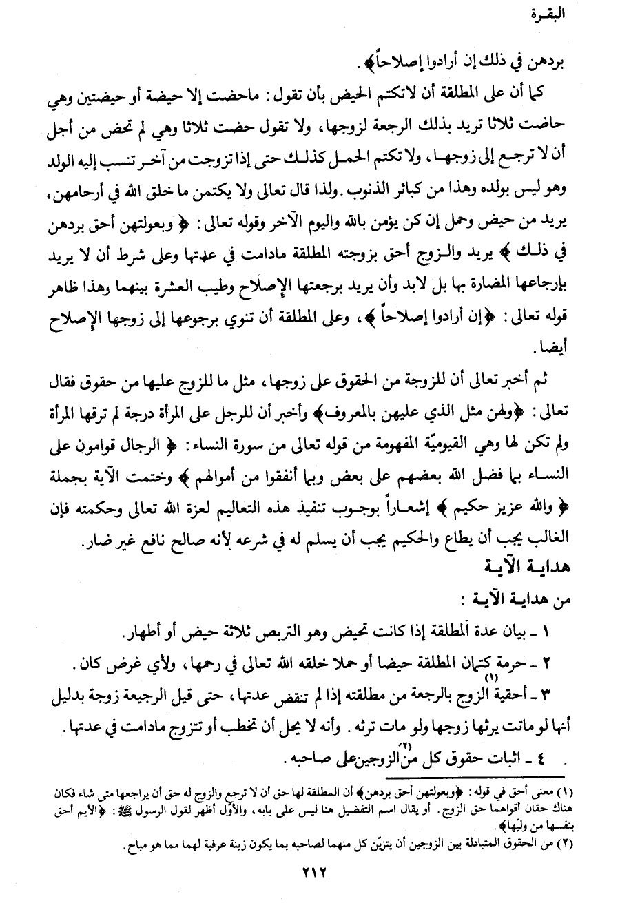 1 معنى أحق في قوله: {وَبُعُولَتُهُنَّ أَحَقُّ بِرَدِّهِنَّ} أن المطلقة لها حق أن لا ترجع والزوج له حق أن يراجعها متى شاء فكان هناك حقان أقواهما حق الزوج. أو يقال: اسم التفضيل هنا ليس على بابه، والأول أظهر لقول الرسول صَلَّى اللهُ عَلَيْهِ وَسَلَّمَ: "الأيم أحق بنفسها".