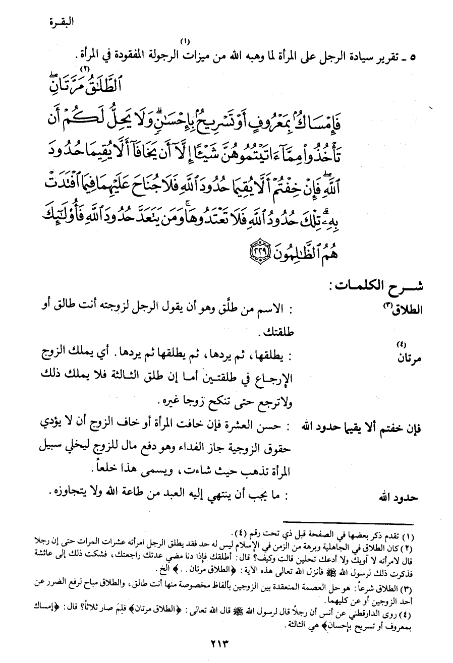 {الطَّلاقُ2 مَرَّتَانِ فَإِمْسَاكٌ بِمَعْرُوفٍ أَوْ تَسْرِيحٌ بِإِحْسَانٍ وَلا يَحِلُّ لَكُمْ أَنْ تَأْخُذُوا مِمَّا آتَيْتُمُوهُنَّ شَيْئاً إِلا أَنْ يَخَافَا أَلا يُقِيمَا حُدُودَ اللهِ فَإِنْ خِفْتُمْ أَلا يُقِيمَا حُدُودَ اللهِ فَلا جُنَاحَ عَلَيْهِمَا فِيمَا افْتَدَتْ بِهِ تِلْكَ حُدُودُ اللهِ فَلا تَعْتَدُوهَا وَمَنْ يَتَعَدَّ حُدُودَ اللهِ فَأُولَئِكَ هُمُ الظَّالِمُونَ (229) }