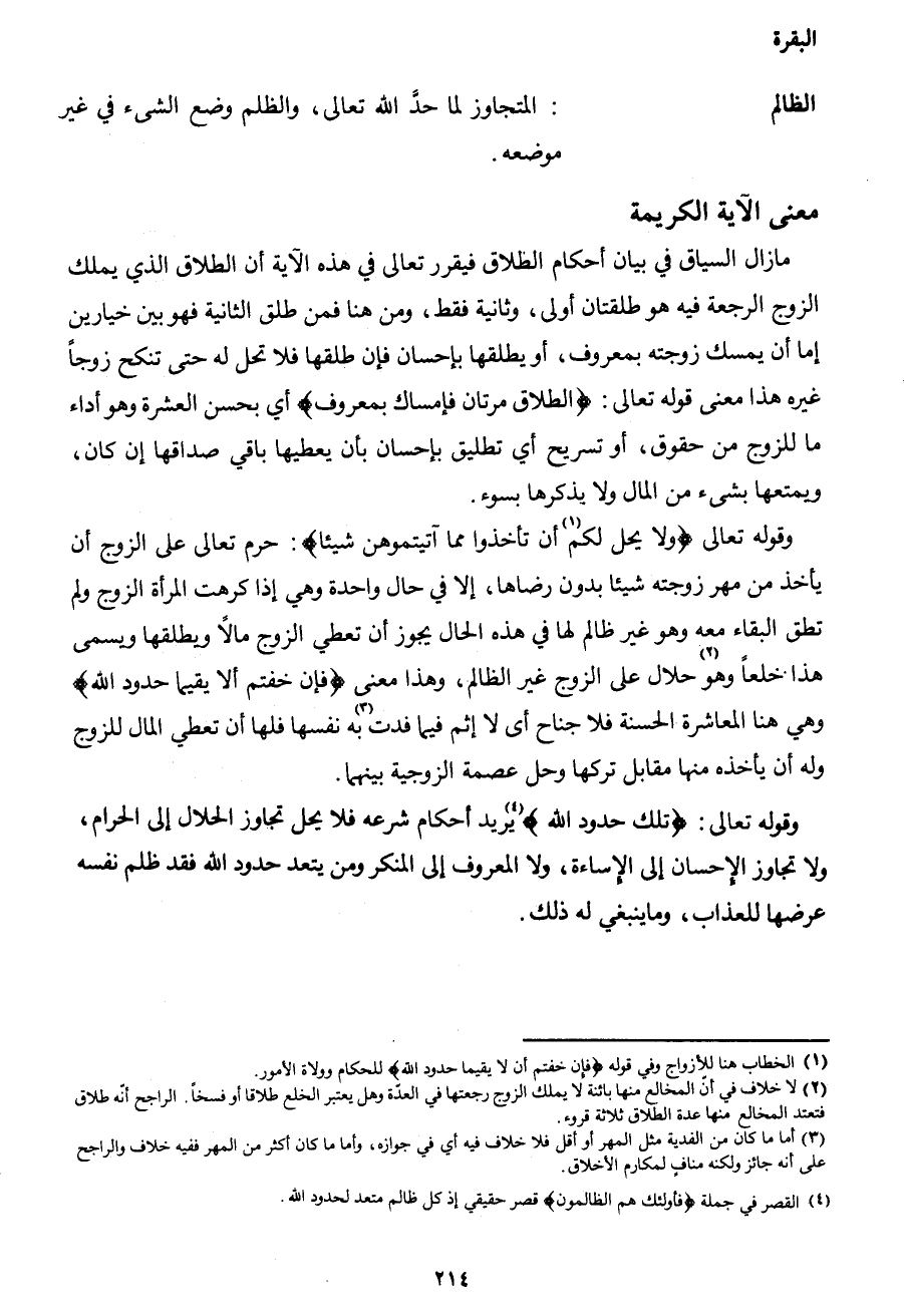 وقوله تعالى: {وَلا يَحِلُّ لَكُمْ1 أَنْ تَأْخُذُوا مِمَّا آتَيْتُمُوهُنَّ شَيْئاً} : حرم تعالى على الزوج أن يأخذ من مهر زوجته شيئاً بدون رضاها، إلا في حال واحدة وهي إذا كرهت المرأة الزوج ولم تطق البقاء معه، وهو غير ظالم لها في هذه الحال يجوز أن تعطي الزوج مالاً ويطلقها ويسمى هذا خلعاً، وهو2 حلال على الزوج غير الظالم، وهذا معنى: {فَإِنْ خِفْتُمْ أَلا يُقِيمَا حُدُودَ اللهِ} وهي هنا المعاشرة الحسنة فلا جناح أي لا إثم فميا فدت3 به نفسها فلها أن تعطي المال للزوج وله أن يأخذه منها مقابل تركها وحل عصمة الزوجية بينهما.