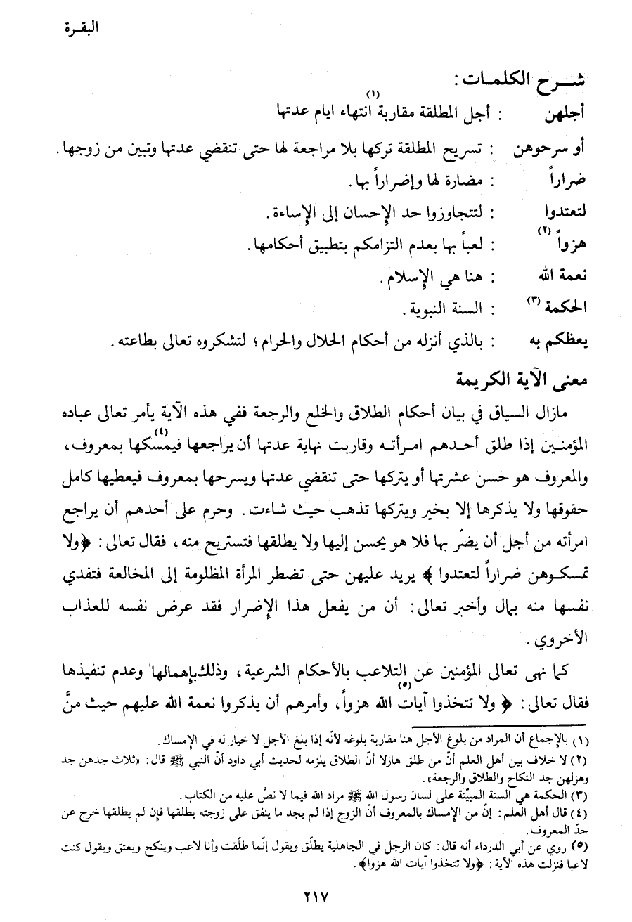 ما زال السياق في بيان أحكام الطلاق والخلع والرجعة ففي هذه الآية يأمر تعالى عباده المؤمنين إذا طلق أحدهم امرأته وقاربت نهاية عدتها أن يراجعها فيمسكها4 بمعروف، والمعروف هو حسن عشرتها أو يتركها حتى تنقضي عدتها ويسرحها بمعروف فعيطيها كامل حقوقها ولا يذكرها إلا بخير ويتركها تذهب حيث شاءت. وحرم على أحدهم أن يراجع امراته من أجل أن يضر بها فلا هو يحسن إليها ولا يطلقها فتستريح منه، فقال تعالى: {وَلا تُمْسِكُوهُنَّ ضِرَاراً لِتَعْتَدُوا} يريد عليهن حتى تضطر المرأة المظلومة إلى المخالعة فتفدي نفسها منه بمال وأخبر تعالى: أن من يفعل هذا الإضرار فقد عرض نفسه للعذاب الأخروي.