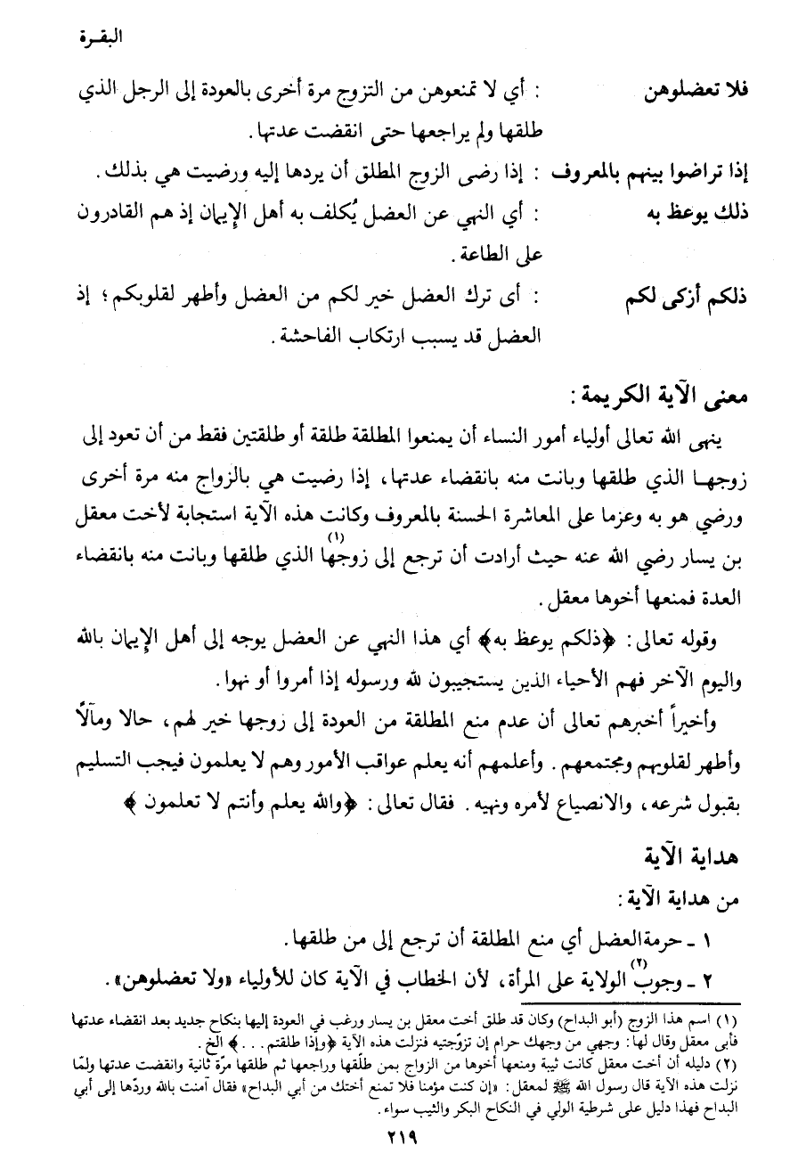 ينهى الله تعالى أولياء أمور النساء أن يمنعوا المطلقة طلقة أو طلقتين فقط من أن تعود إلى زوجها الذي طلقها وبانت منه بانقضاء عدتها، إذا رضيت هي بالزواج منه مرة أخرى ورضي هو به وعزما على المعاشرة الحسنة بالمعروف وكانت هذه الآية استجابة لأخت معقل بن يسار رضي الله عنه حيث أرادت أن ترجع إلى زوجها1 الذي طلقها وبانت منه بانقضاء العدة فمنعها أخوها معقل.