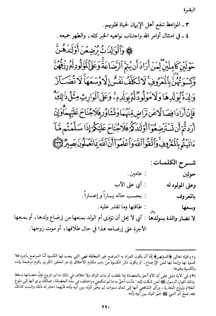 {وَالْوَالِدَاتُ يُرْضِعْنَ أَوْلادَهُنَّ حَوْلَيْنِ كَامِلَيْنِ لِمَنْ أَرَادَ أَنْ يُتِمَّ الرَّضَاعَةَ وَعَلَى الْمَوْلُودِ لَهُ رِزْقُهُنَّ وَكِسْوَتُهُنَّ1 بِالْمَعْرُوفِ لا تُكَلَّفُ نَفْسٌ إِلا وُسْعَهَا لا تُضَارَّ وَالِدَةٌ بِوَلَدِهَا وَلا مَوْلُودٌ لَهُ بِوَلَدِهِ وَعَلَى الْوَارِثِ مِثْلُ ذَلِكَ فَإِنْ أَرَادَا فِصَالاً عَنْ تَرَاضٍ مِنْهُمَا وَتَشَاوُرٍ فَلا جُنَاحَ عَلَيْهِمَا وَإِنْ أَرَدْتُمْ أَنْ تَسْتَرْضِعُوا أَوْلادَكُمْ فَلا جُنَاحَ عَلَيْكُمْ إِذَا سَلَّمْتُمْ مَا آتَيْتُمْ بِالْمَعْرُوفِ وَاتَّقُوا اللهَ وَاعْلَمُوا أَنَّ اللهَ بِمَا تَعْمَلُونَ بَصِيرٌ (233) }