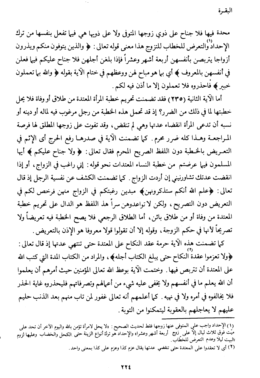 أما الآية الثانية (235) فقد تضمنت تحريم خطبة المرأة المعتدة من طلاق أو وفاة فلا يحل خطبتها لما في ذلك من الضرر؟ إذ قد تحمل هذه الخطبة من رجل مرغوب فيه لماله أو دينه أو نسبه أن تدعي المرأة انقضاء عدتها وهي لم تنقض، وقد تفوت على زوجها المطلق لها فرصة المراجعة، وهذا كله ضرر محرم. كما تضمنت الآية في صدرها رفع الحرج، أي: الإثم في التعريض بالخطبة دون اللفظ الصريح المحرم فقال تعالى: {وَلا جُنَاحَ عَلَيْكُمْ} أيها المسلمون فيما عرضتم من خطبة النساء المعتدات نحو قوله: إني راغب في الزواج، أو إذا انقضت عدتك تشاورينني إن أردت الزواج. كما تضمنت الكشف عن نفسية الرجل إذ قال تعالى: {عَلِمَ اللهُ أَنَّكُمْ سَتَذْكُرُونَهُنَّ} مبدين رغبتكم منهن فرخص لكم في التعريض دون التصريح، ولكن لا تواعدوهن سراً هذا اللفظ هو الدال على تحريم خطبة المعتدة من وفاة أو من طلاق بائن، أما الطلاق الرجعي فلا يصح الخطبة فيه تعريضاً ولا تصريحاً؛ لأنها في حكم الزوجة، وقوله: {إِلا أَنْ تَقُولُوا قَوْلاً مَعْرُوفاً} هو الإذن بالتعريض.